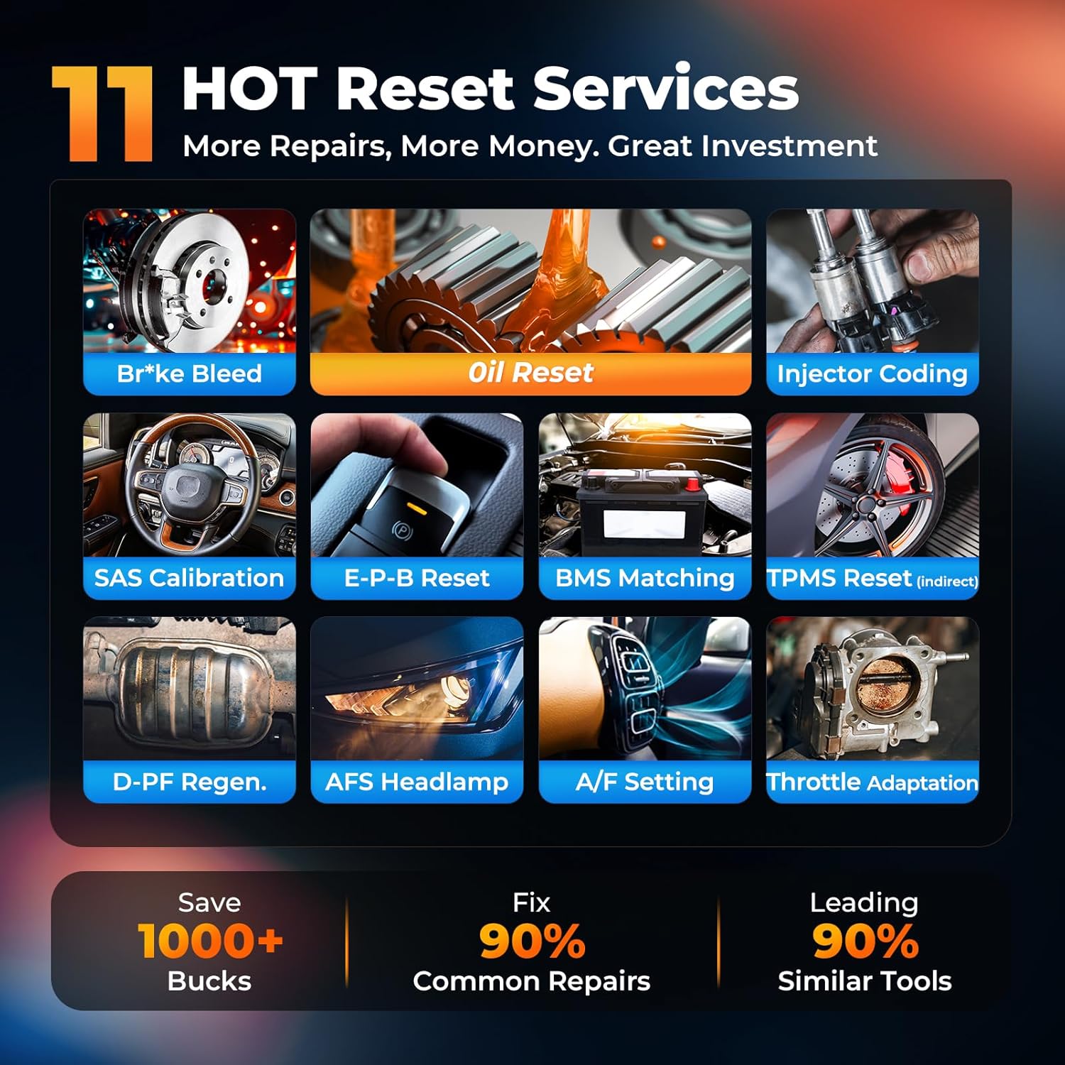 - ă11 Hottest Maintenance ServicesăDiffer from MD808 PRO MD808 and other car scanner like NT716 CRP129X only 7 tests, Autel MD906 PRO obd2 scanner for cars provides 11 resets, same as MD909 PRO, including Oil Reset, ABS Break Bleeding, Injector Coding, SAS, Throttle, EPB, BMS, TPMS, D-P*F, AFS Headlamp, A/F. Works with 1996+ OBD2/EOBD/JOBD vehicles globally. this tool saves you time and money, making it perfect for post-repair calibrations!