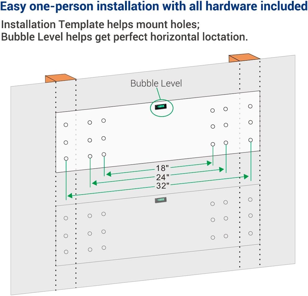 - Suitable for wood stud spacing of 18", 24" or 32". Can NOT be mounted to metal wall.