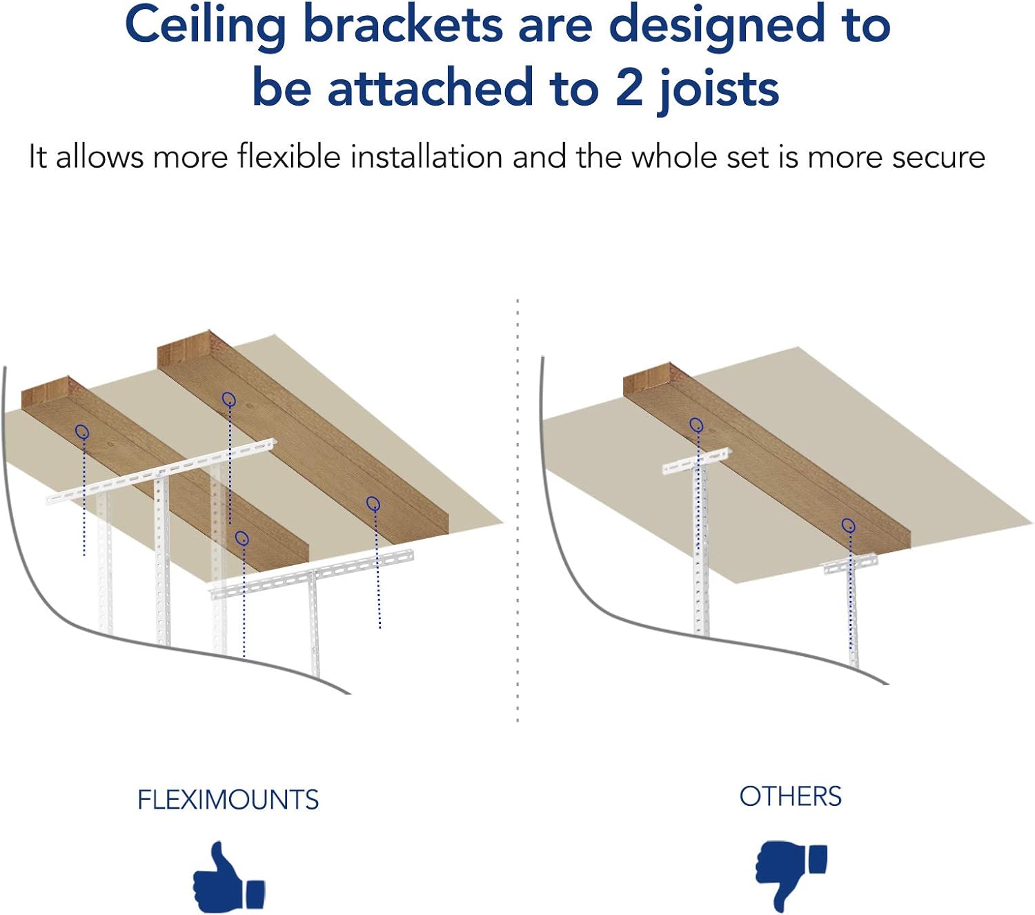 - Stability & Safety: With our specially designed longer ceiling brackets attaching to two joists and integrated grid design, FLEXIMOUNTS overhead garage storage racks are more stable and secure compared to others.