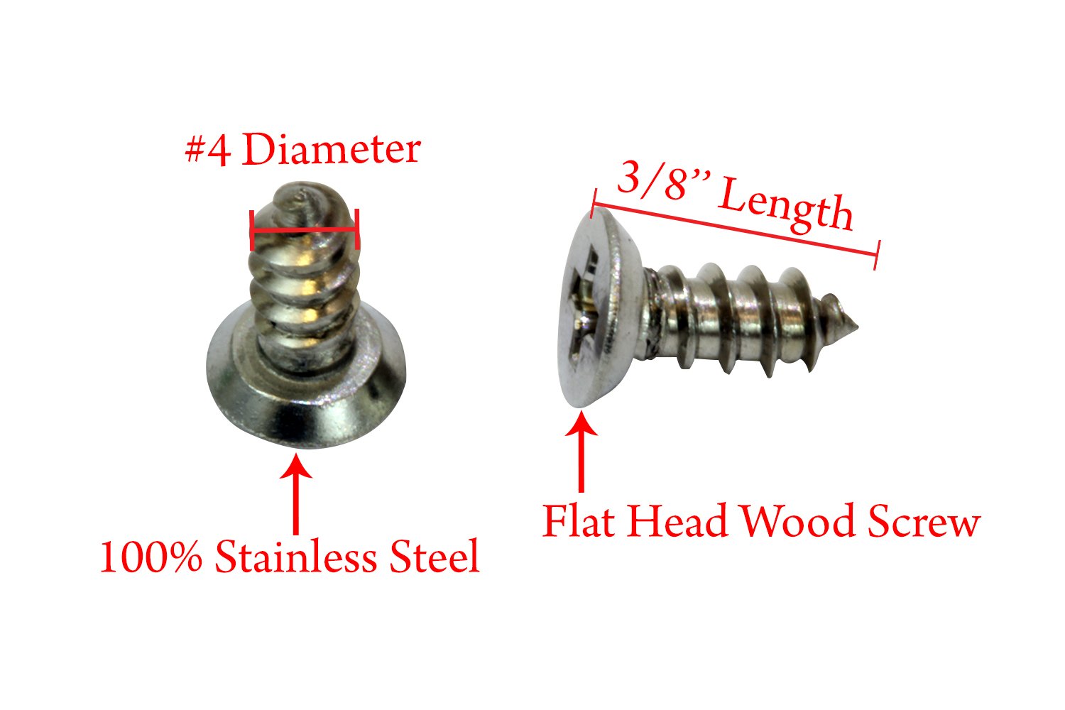 - 【Dimensions】Diameter: #4 | Length: 3/8" | Thread Type: Coarse (standard) | Head: Flat | Drive: Phillips #1 | Quantity: 100 pcs | Material: 18-8 (304) Stainless Steel.