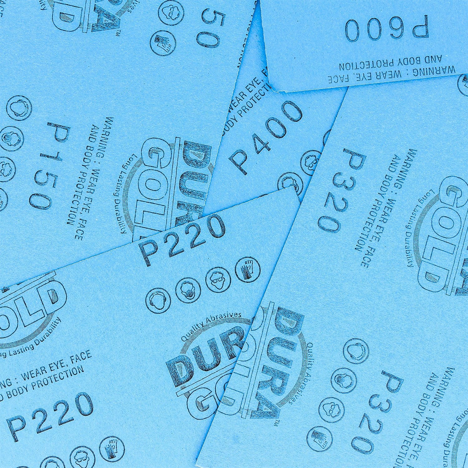- Variety Pack Box of 25 Dura-Gold Premium 5-1/2" Wide x 9" Long Wet or Dry Sandpaper Sheets. Pack includes 5 sheets each of 5 different sanding grits: 150, 220, 320, 400, and 600 Grit. These high-performance, durable wet or dry sanding sheets are flexible when used wet and will not fall apart, tear, or crumble while in use.