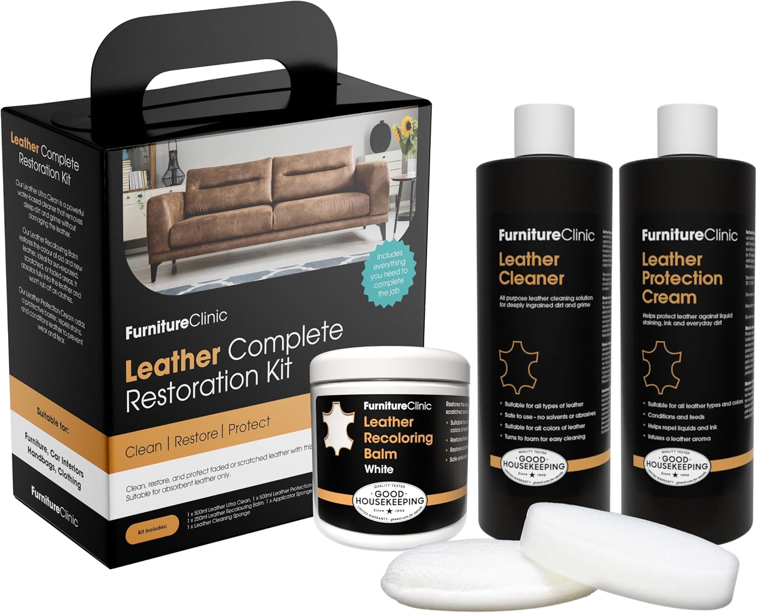 Furniture Clinic Leather Complete Restoration Kit | with Leather Recoloring Balm, Cleaner, 2-in-1 Protection Cream & Conditioner, Sponge, and Cloth | Repair Kit for Furniture (White)