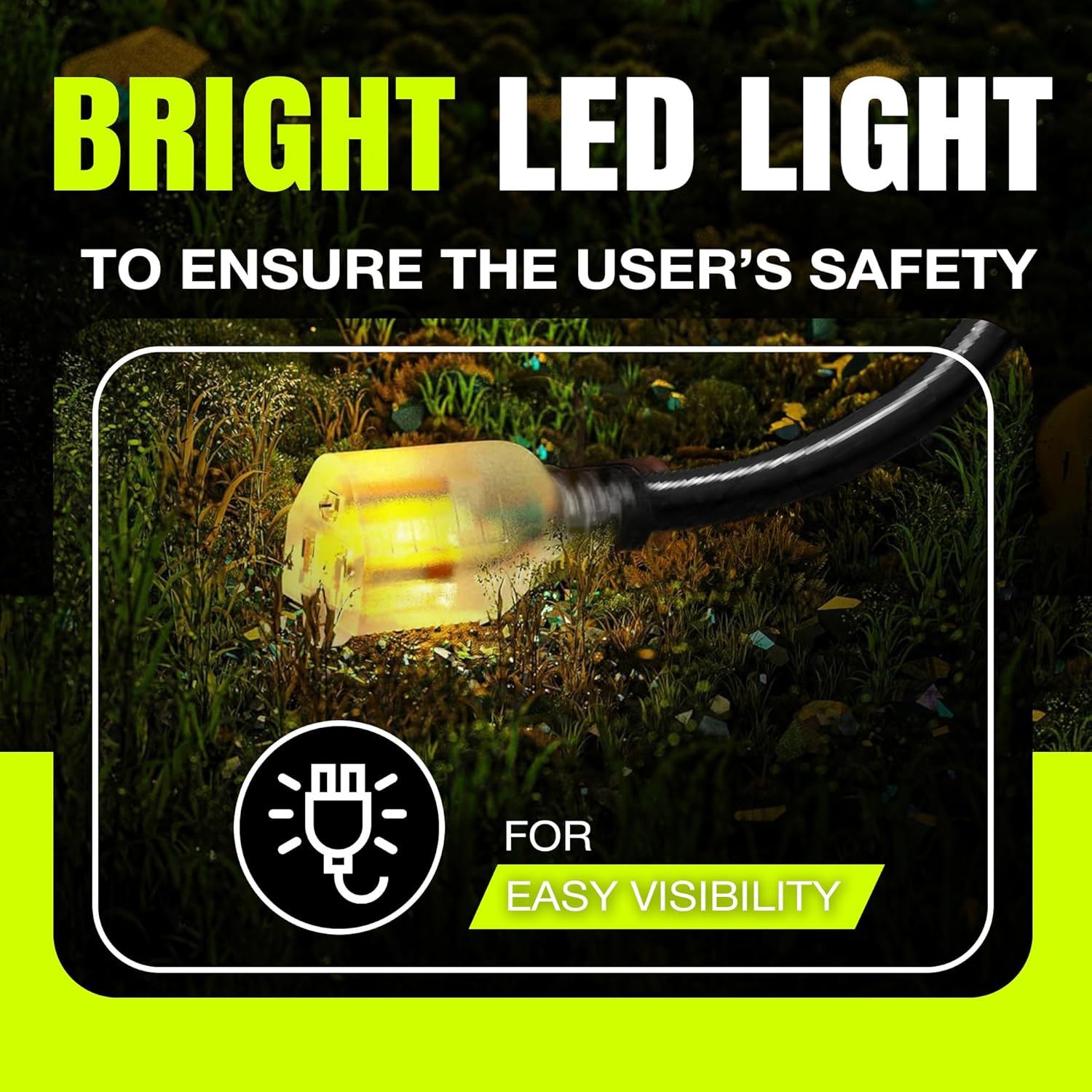 - LIGHTED END FOR VISIBILITY & SAFETY: With a lighted end to indicate power and a brightly colored PVC jacket, this three prong extension cord minimizes tripping hazards and improves safety in busy or poorly lit areas. Stay safe while powering up with an easily noticeable extension cable. The innovative design not only enhances operational safety but also ensures that the indoor / outdoor power cord is easily identifiable among your tools and equipment, preventing accidental disconnections.