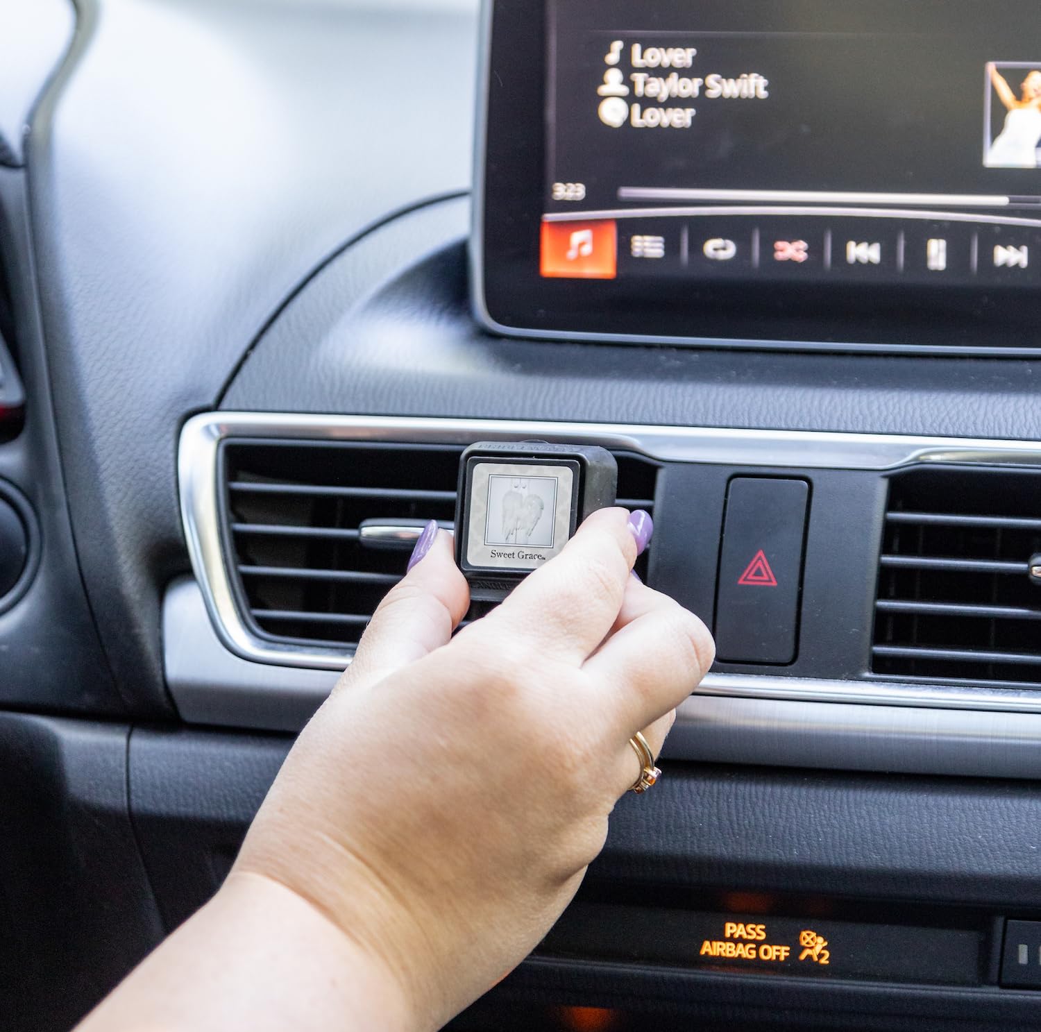 - Remove your new Auto Vent Clip from its packaging and raise the clip that's attached to the back. Turn the dial at the top of the Auto Vent Clip to the open position. Connect your Auto Vent Clip to the air vent in your vehicle by sliding the clip onto one of the slats. Adjust the intensity of your fragrance using the same dial at the top.