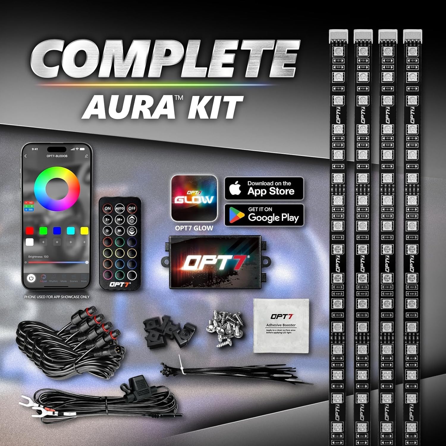 - Included Components : 1 x 10ft Inline Fuse Power Wire, 1 x 21-Key Remote, 1 x OPT7 Glow Control Box, 2 x 10ft + 2 x 13 ft Extension Wires, 4 x 24" LED Strips with Adhesive Back 1 x 10ft Inline Fuse Power Wire, 1 x 21-Key Remote, 1 x OPT7 Glow Control Box, 2 x 10ft + 2 x 13 ft Extension Wires, 4 x 24" LED Strips with Adhesive Back