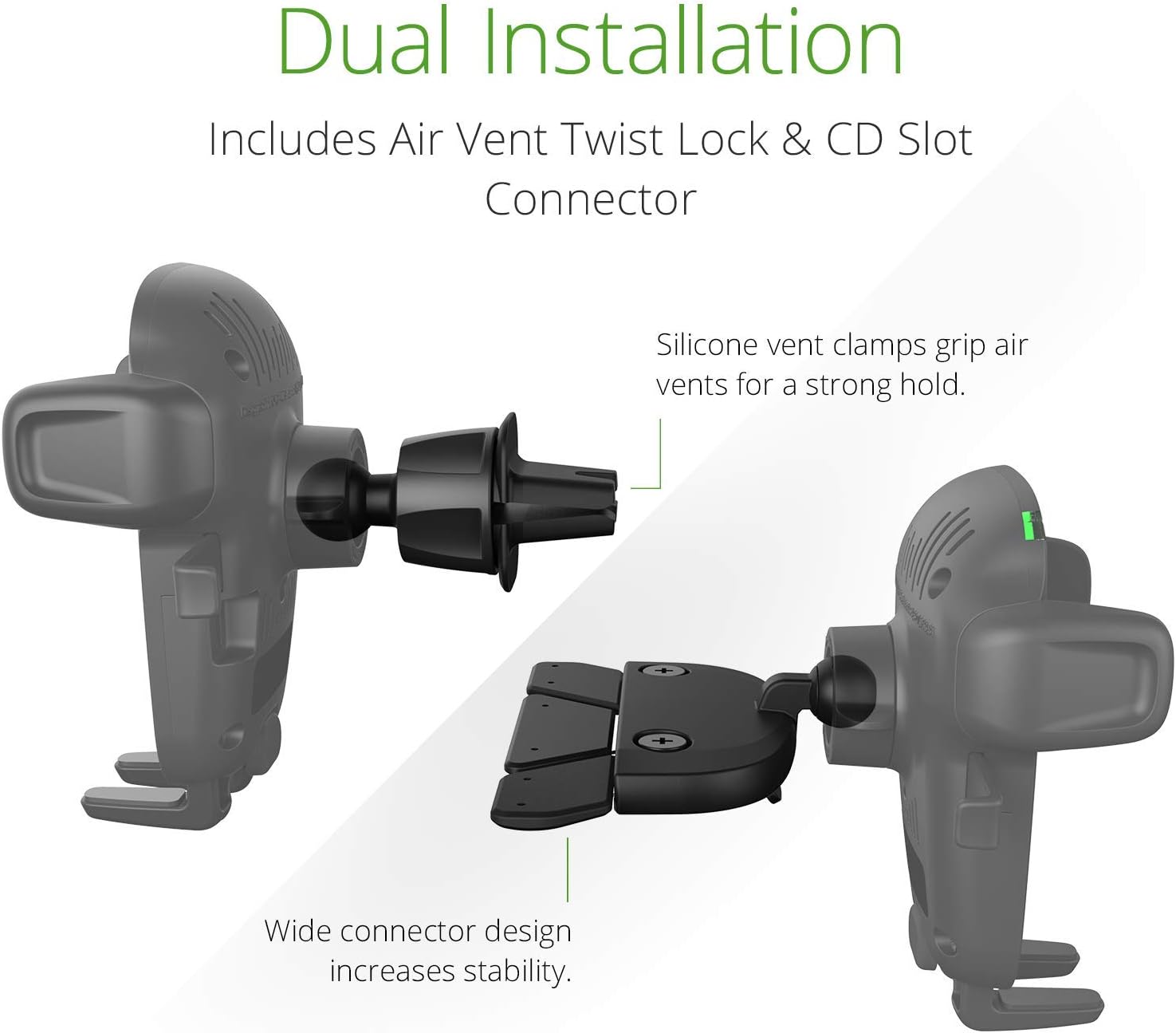 - Multiple Installation Options: The Mount contains two mounting brackets. A CD slot connector and an Air Vent Bracket.