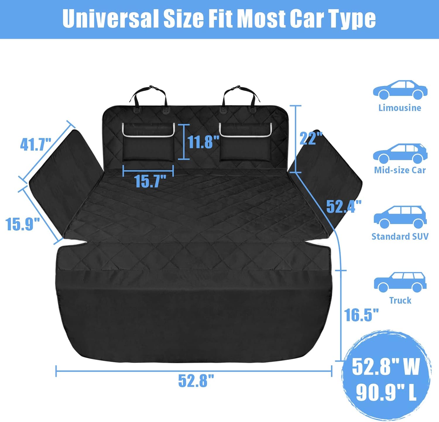 - Multi-Vehicle Adaptability - 53.5" x 93", fits most vehicles, this large heavy duty pet cargo mat seamlessly extends from second-row seats to the bumper, providing full coverage for full-size, mid-size SUVs, crossovers, minivans and sedans. Perfect for road trips or daily use when seats are folded down