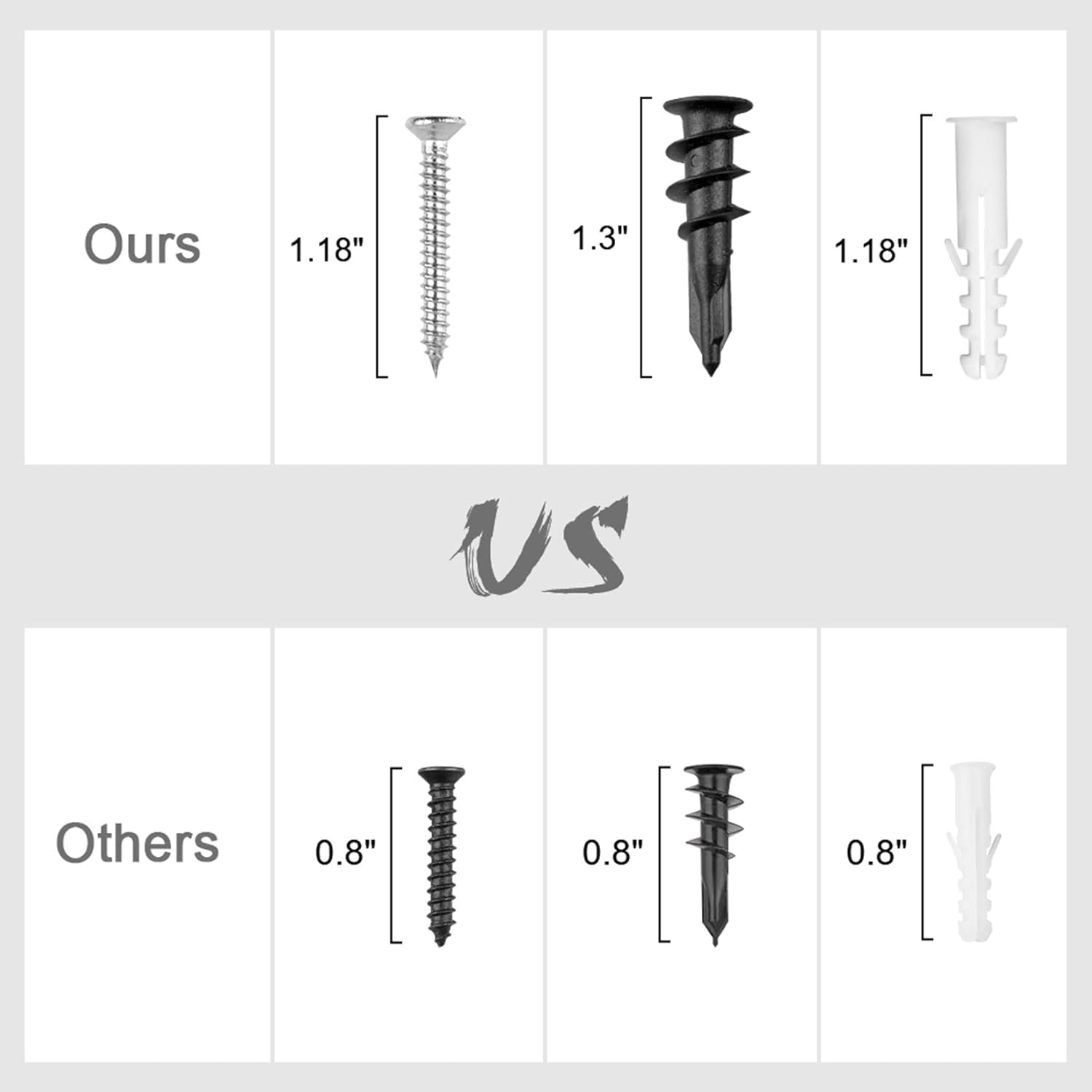 - 【EASY TO INSTALL & BEARING CAPACITY】 These garage hooks are suitable for plaster, wood, brick, and concrete walls. You can install them effortlessly. For plaster walls, (1)Mark two big holes; (2)Twist the black wide thread screw plug in. For wooden/brick walls, (1)Mark two small holes; (2) Drill a hole and hammer in the white plastic anchor; (3) Twist the steel screw nail into the anchor. The bearing capacity depends on different types of walls; different sizes of tool hooks and screws