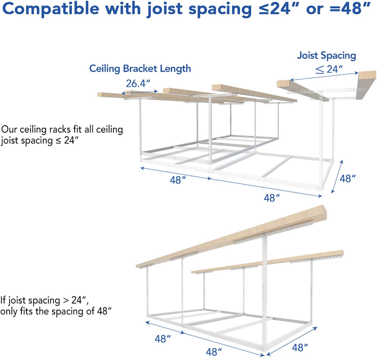 - DIY INSTALLATION: Installation Template helps drill mount holes. This overhead storage rack fits all ceiling joist spacing ≤ 24", if joist spacing > 24",only fits the ceiling spacing of 48".