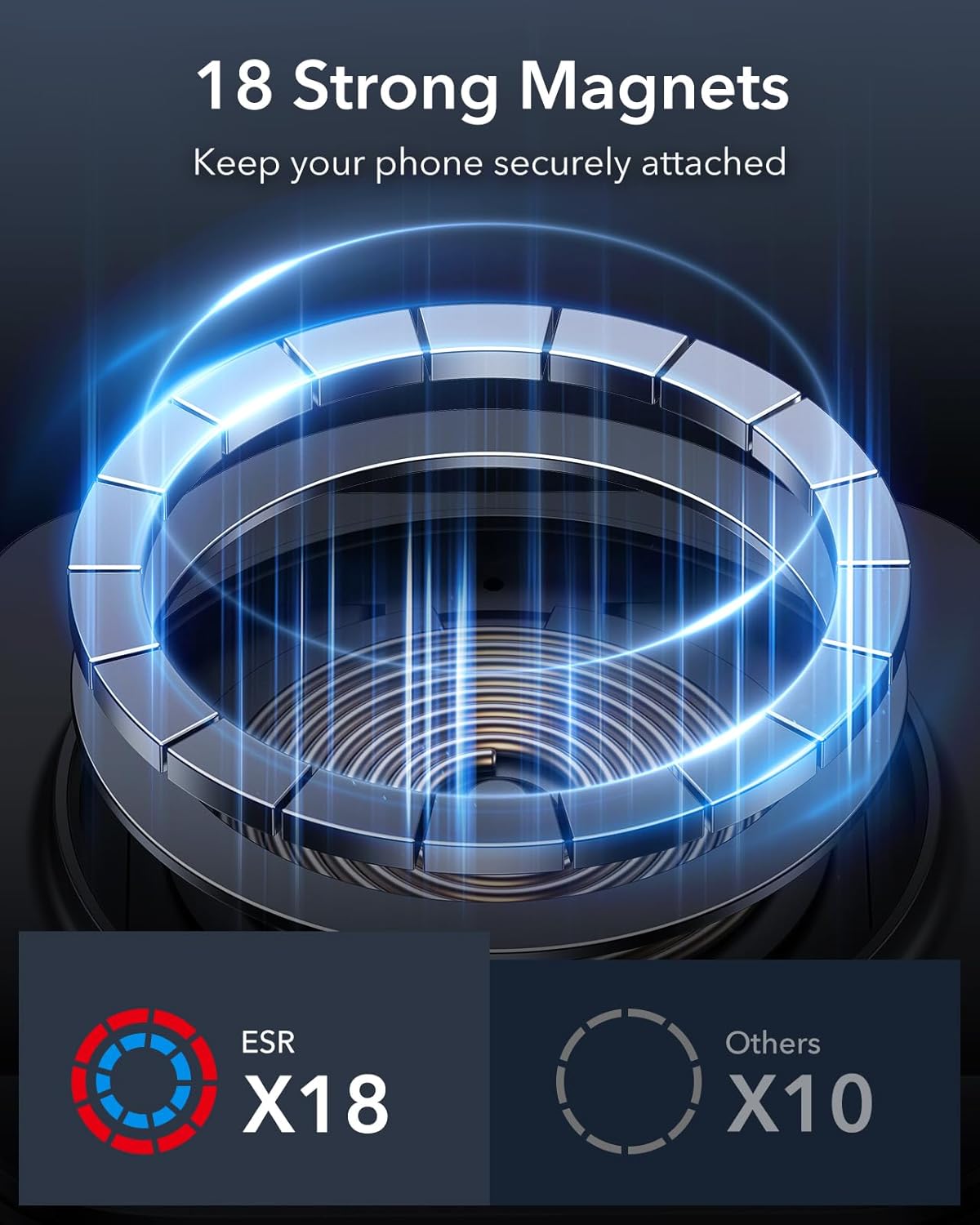 - Secure Magnetic Lock: powerful magnets with 1,600 g of holding force and a non-slip silicone ring keep your phone securely in place, even when driving on bumpy roads; combine with an ESR HaloLock case for an even stronger magnetic hold