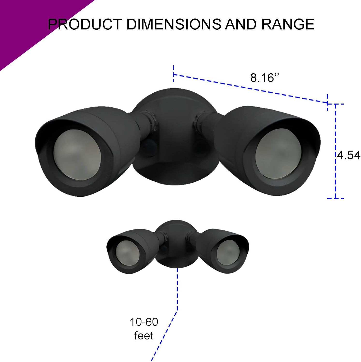 - Product specifications and technical details constitute the following Height – 4.54 inches, Width – 8.16, Weight – 2.41 lbs and features an Extension of 8.80 inches. The Security Flood Light is non-dimmable and features a built-in surge protection of 2KV. The security light is IP65 rated which can withstand any weather conditions and also Energy Star certified which delivers a product life of 50,000 Hours long-lasting light.