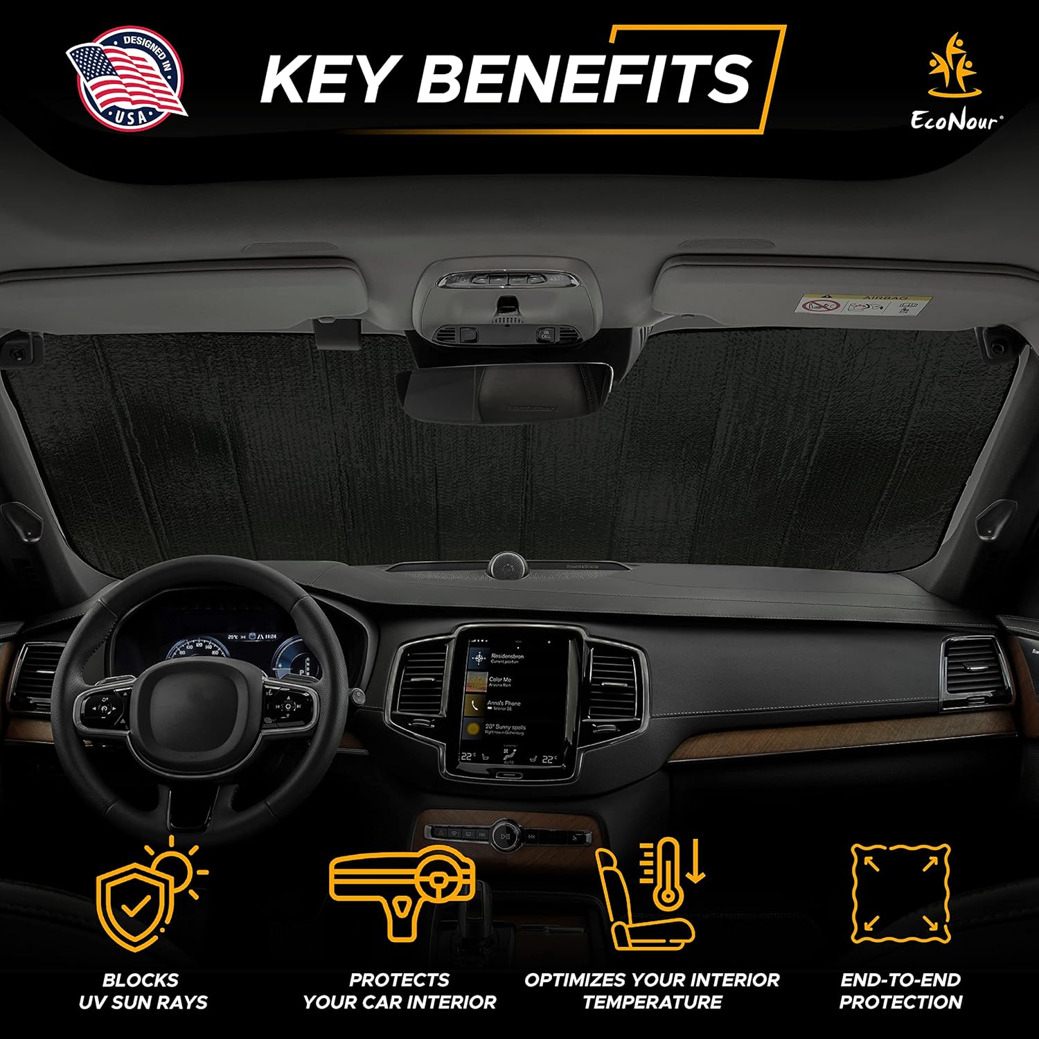 - Superior Sun Heat & UV Protection: EcoNour’s accordion sunshade for car windshield is designed to effectively block harmful UV rays, keeping your car's interior cool and comfortable. This car windshield sun shade works as a powerful car sun shade windshield that helps protect your dashboard from fading and cracking by reducing heat and sunlight exposure.