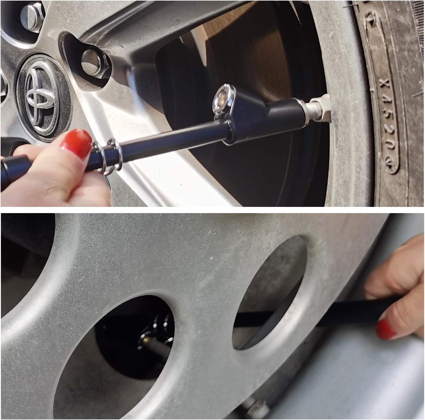 - 1. LONG ZINC ALLOY DUAL HEAD DESIGN : Straight foot air chuck are deisghed for inner wheels or difficult reached valve as well as the 30°reverse chuck are for outer wheels.A good choice for testing your tire pressure