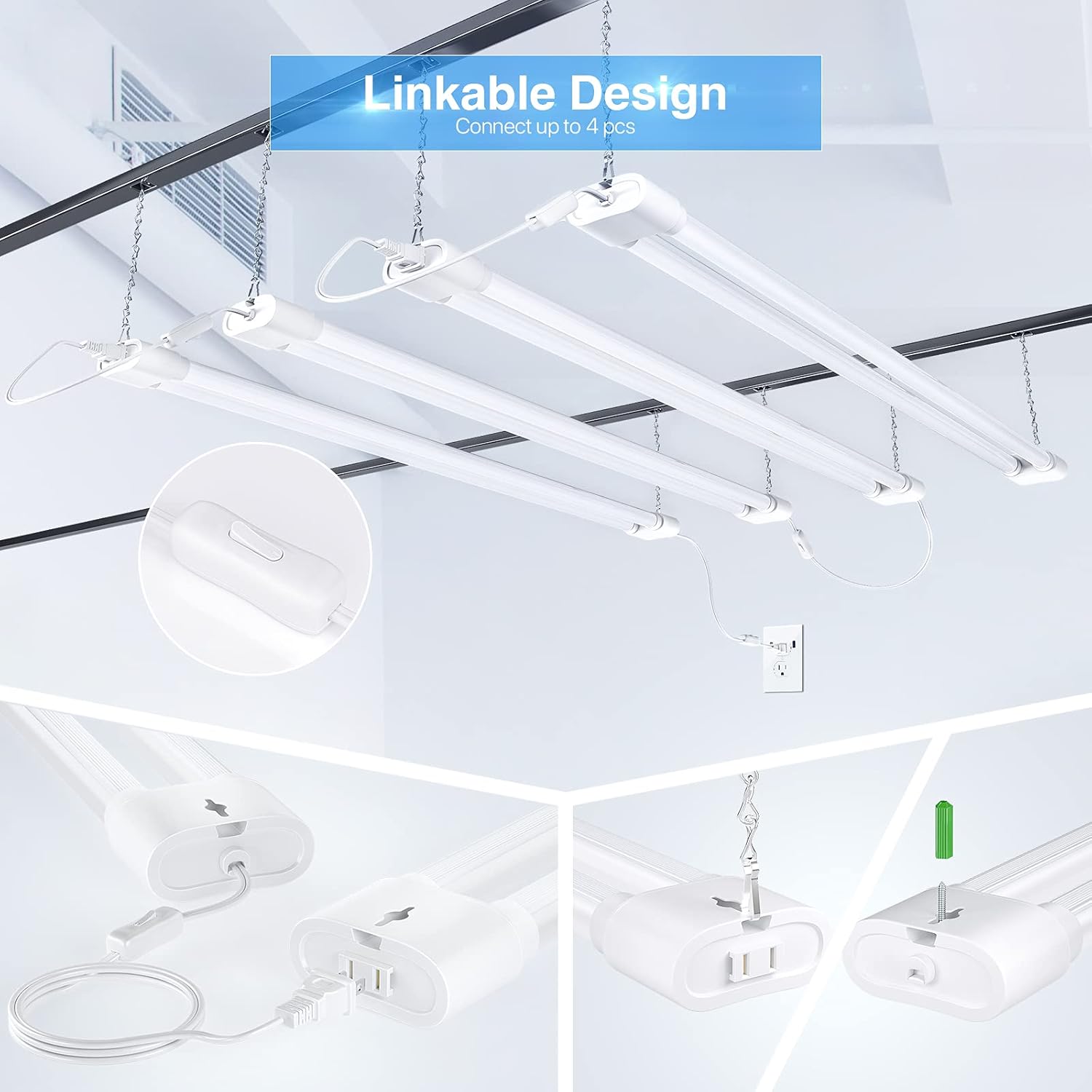- 💡Linkable - Up to 4 of these led linkable shop lights can be connected together seamlessly with accessories provided to save energy. Daisy chain design and no additional wiring to save your time.