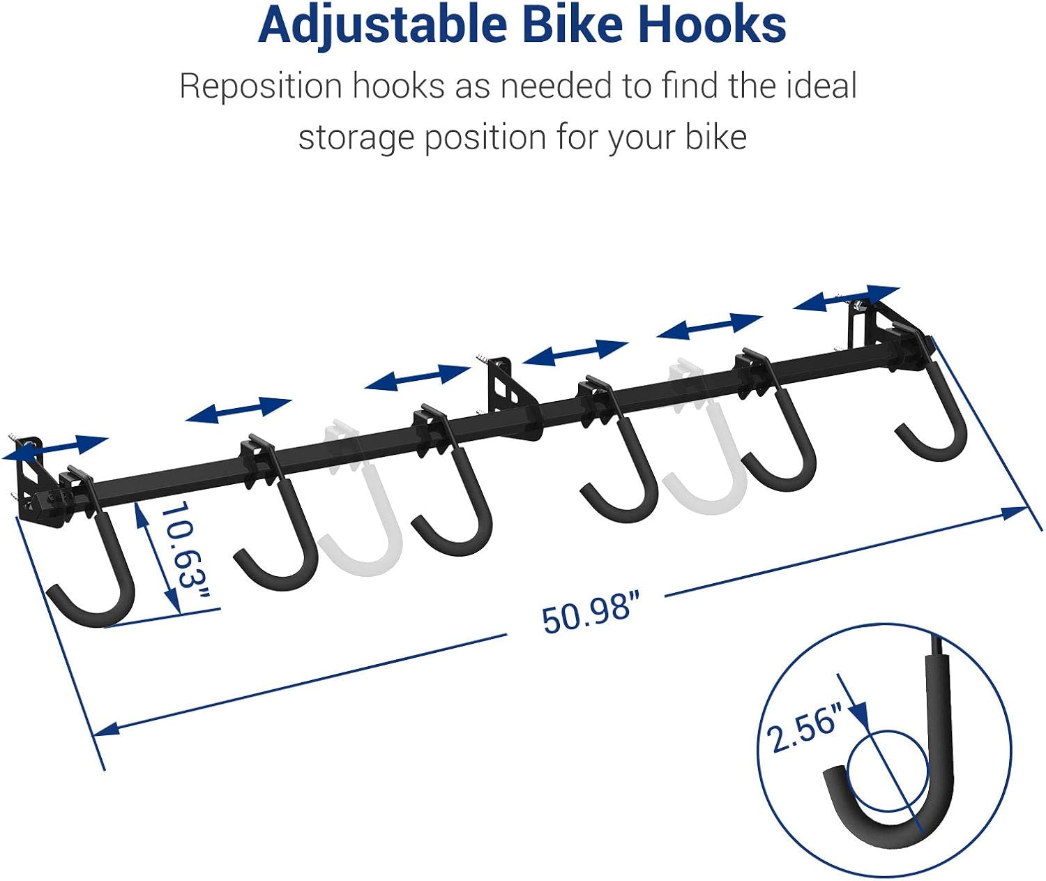 - High-Quality Materials: Solid materials support up to 6 bikes and 300lbs/136kg!Made from powder-coated, cold-rolled steel for durability — resists rusting, chipping and cracking. Includes premium bike hooks that are wrapped with dense sponge foam tubing to prevent aging and cracking while also offering better protection for your bike's wheels, hubs, and spokes.