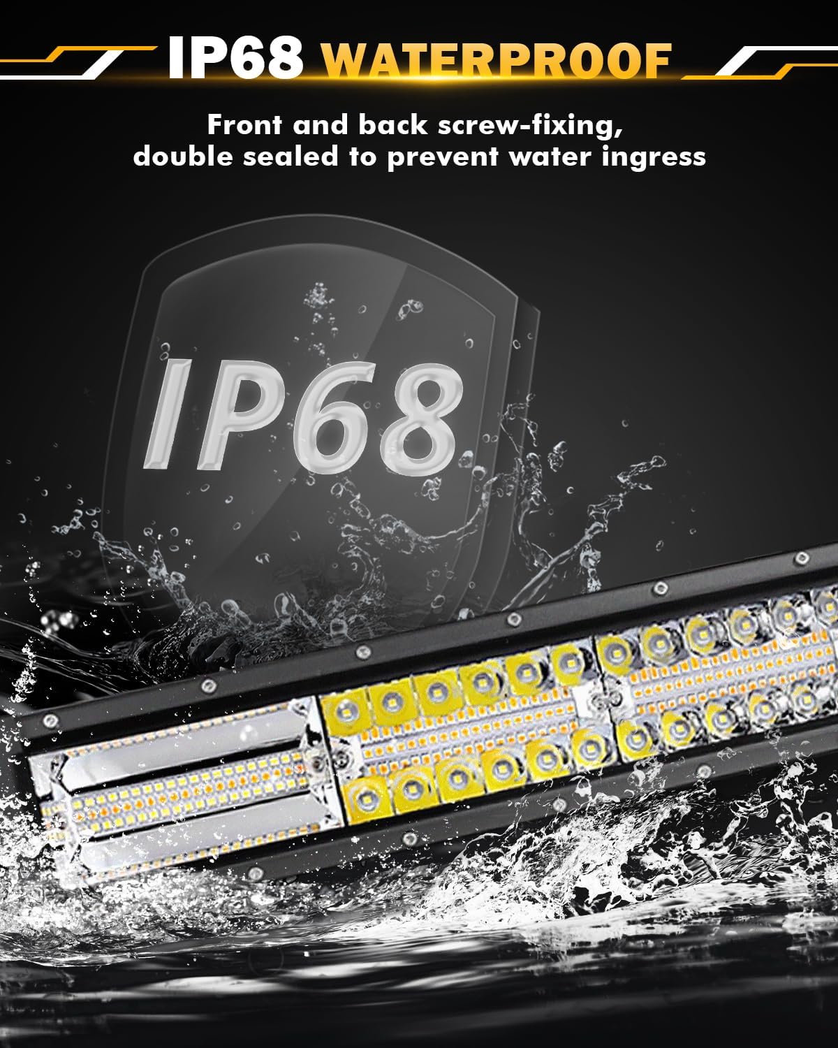 - 【IP68 WATERPROOF RATE】6 modes light bar built in IP68 waterproof, adopts upgraded waterproof die-casting aluminum housing and advanced sealing technology to withstand any harsh environments and weather conditions. Also, our lights are with built-in no electromagnetic interference (EMC), resolve the issue of radio interference and flickering