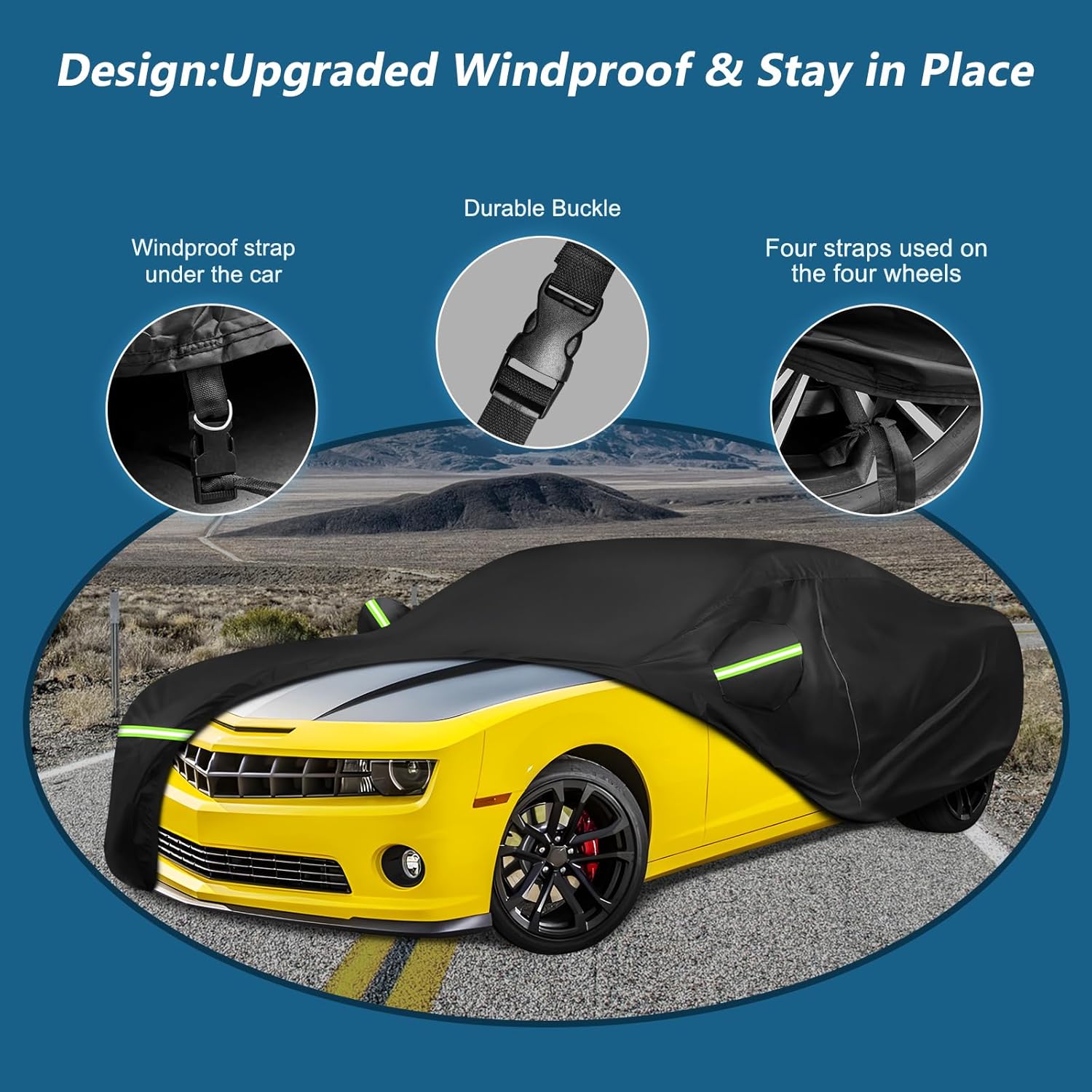 for Camaro Full Car Cover 2010-2025 All Weather, Outdoor Car Covers with Zipper and Soft Cotton Lining, Windproof Heavy Duty Waterproof Protection Fit for 2010-2025 Chevy Camaro (Up to 190''L)