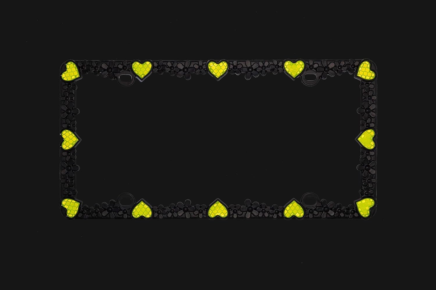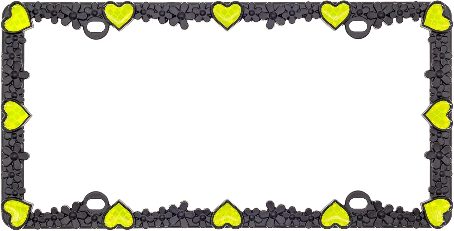 Creathome 3D Daisy Heart License Plate Frame from Pure Zinc Alloy Metal Perfect Plate Holder, Matt Black Daisy with Yellow Reflective Heart