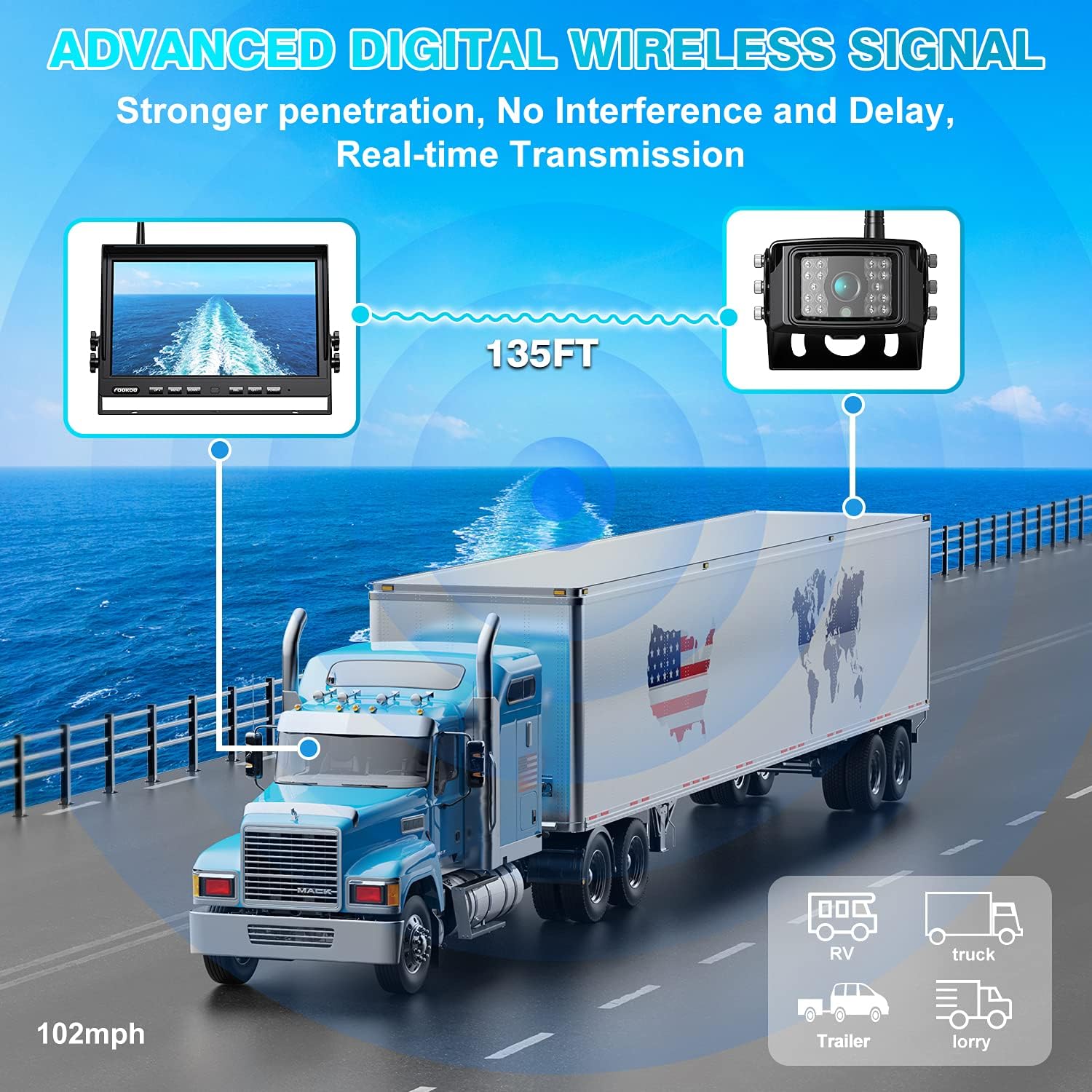 - ăAdvanced Digital Wireless SignalăThe system with stable digital signal works flawlessly within 128ft range in open area, enough for any large vehicles. Even at the high speed of 102 mph, the monitor will display the surroundings in real time, making your driving more convenient. There is no interference, flicker, blurring or delay.