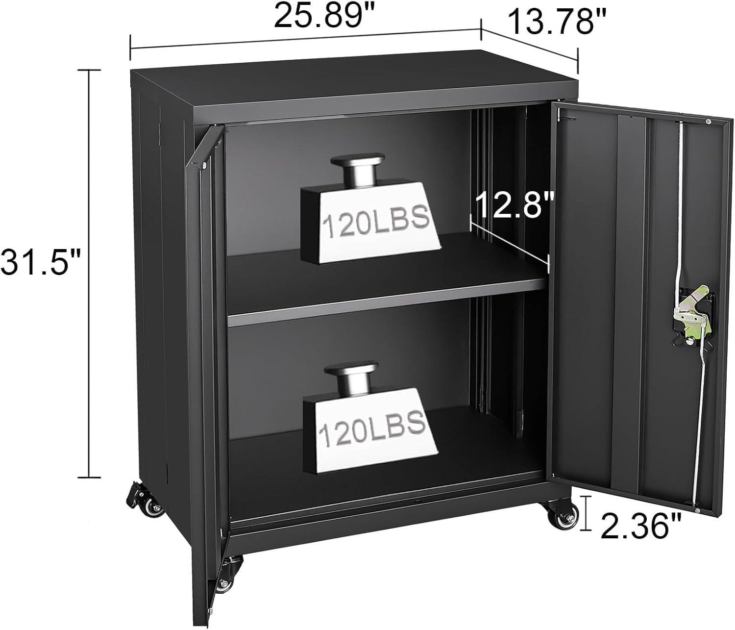 - 🗄【Garage Cabinet】Dimensions: 13.78"D x 25.98"W x 31.5"H. Weight: 36 lbs. Maximum load capacity: 120 lbs. The lockable garage storage cabinet with wheels are made of high-quality steel, making them sturdy and durable. They can be used in various settings, such as the living room, kitchen, garage, storage room, and office.