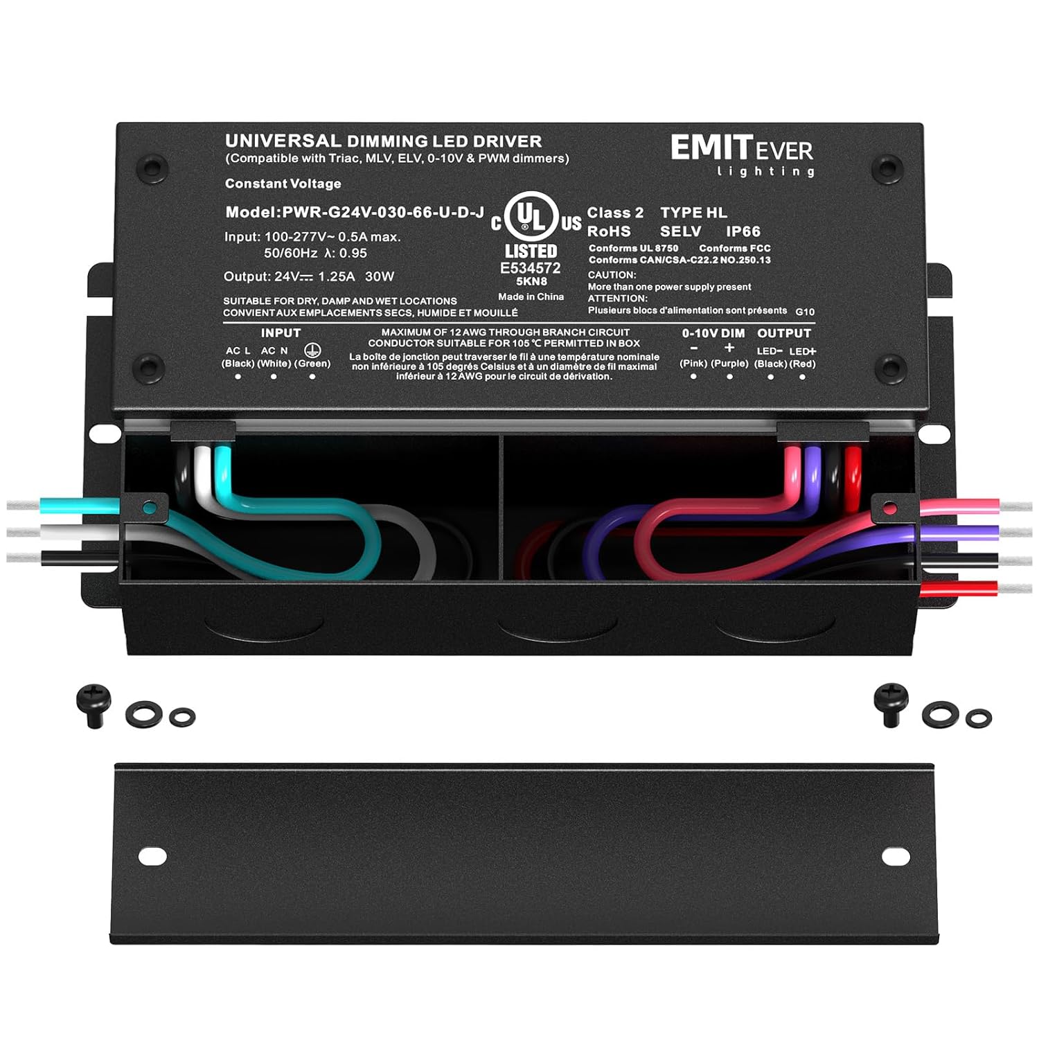 EMITEVER 30W Dimmable LED Driver, 24V Triac Dimmable Power Supply, AC to DC Transformer for LED Light, Compatible with Lutron and Leviton Dimmer, Waterproof IP67 and UL Listed, Class 2