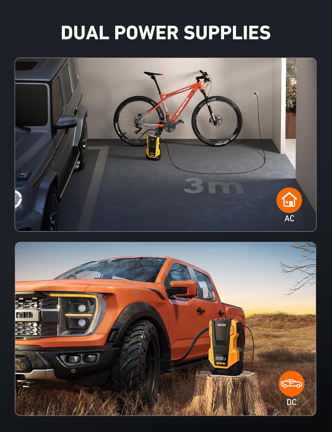 - AC/DC dual power supply design: Our portable air compressor’s multifunctional AC/DC dual power supply design can draw power from both vehicle and wall outlets. Its DC plug is designed for a 12V cigarette lighter socket while its AC plug is designed for a 110V/120V wall outlet.Includes 3 extra nozzles: Suitable for cars, motorbikes, bike tires, sports equipment, and other inflatable items. Our portable air compressor can be used indoors or on the road.