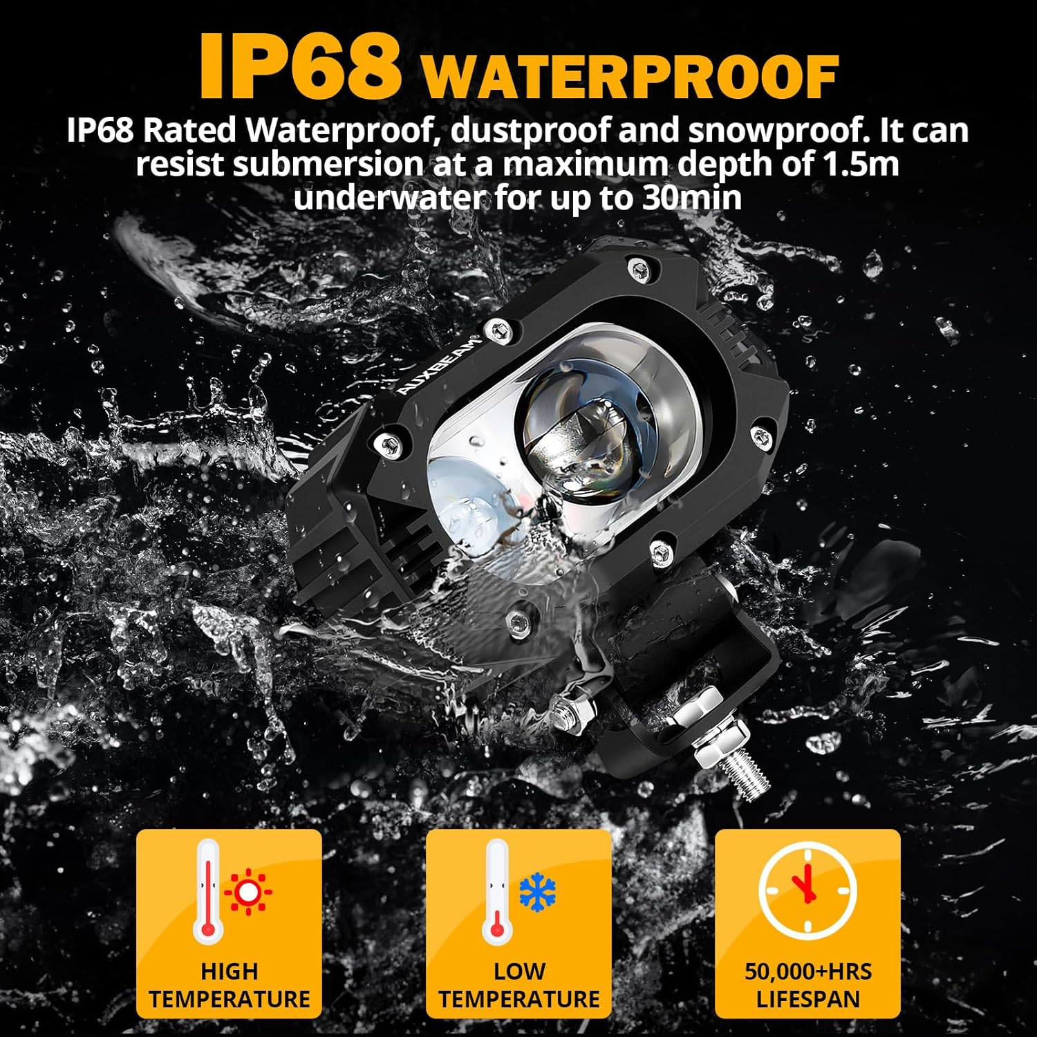- 【HIGHT PERFORMANCE】The LED pod lights meet IP68 international standards and undergo rigorous testing and 100% inspection spot checks. Engineered to withstand harsh environmental and weather conditions, these lights deliver reliable performance whether it's raining or snowing, making them ideal for any adventure.