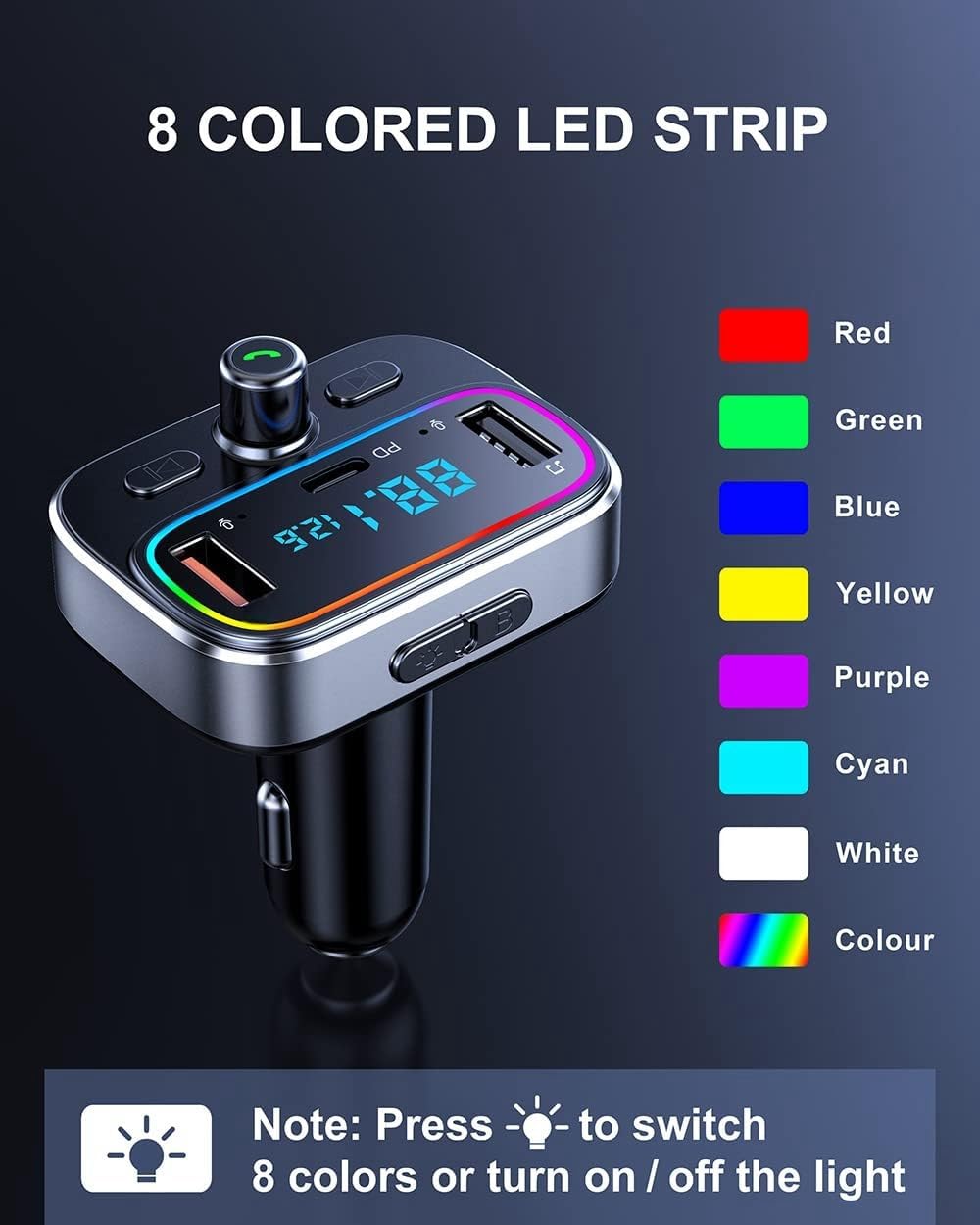- 7 Colored LED Strip & Music Play Modes: FM Transmitter Bluetooth car adapter supports 7 colors LED backlight, including red / green / blue / yello / purple / cyan / silver white, will give you a visually stunning display of colors, which is a nice way to match the colors already in the car. You can stream music on your car stereo via Bluetooth/ USB Disk (≤32GB) / microSD Card (≤32GB).