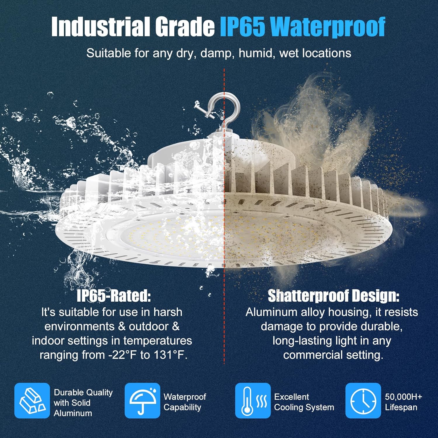 - 【0-10V Dimmable】Our high bay lights have a 0-10V seamless dimming function, which allows you to adjust the brightness of the lights according to your needs. The UL-certified power supply enables the LED high bay to provide instant bright light with no buzzing or flickering for maximum eye comfort. Color rendering index RA>80, and ultra-high luminous flux, providing a high degree of color restoration.