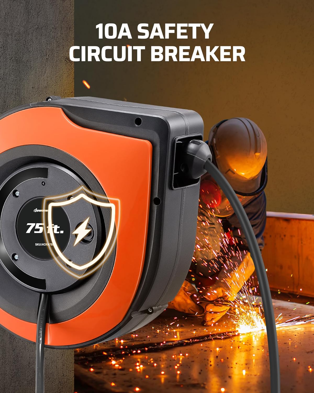 DEWENWILS Retractable Extension Cord Reel, 75 FT Heavy Duty Power Cord, 14/3C SJTOW, Lighted Triple Tap Outlets, 10A Circuit Breaker, Wall/Ceiling Mounted for Garage, Workshop, UL Listed