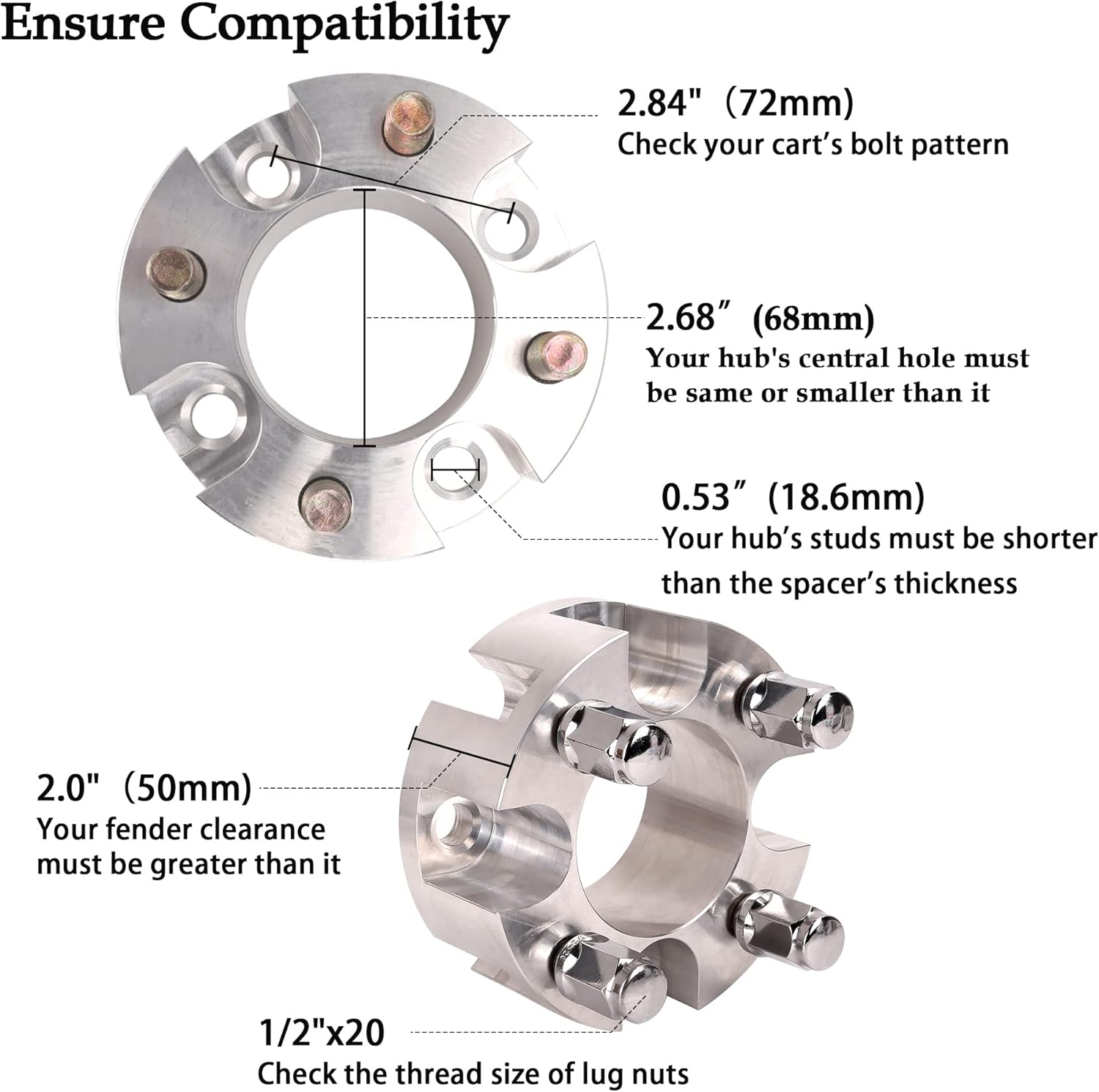 - Specification of 4 wheel spacers: 2" (50mm) thickness, 4x2.84"(72mm) bolt pattern, 3.68"(68mm) hub center bore, come with 16 pcs 1/2"-20 external nuts (internal use of original nuts)