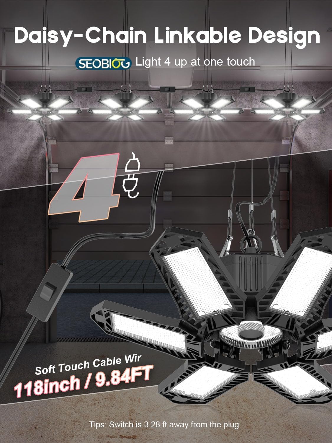 - Linkable LED Shop Light: Each garage LED light comes with 9.84ft of power cord, which can seamlessly link up to 4 garage lights together and control multiple lights with a single switch. The shop light is equipped with hanging chain, which can be freely retracted from 0-3.28ft, and it is easy to install, plug-in and play