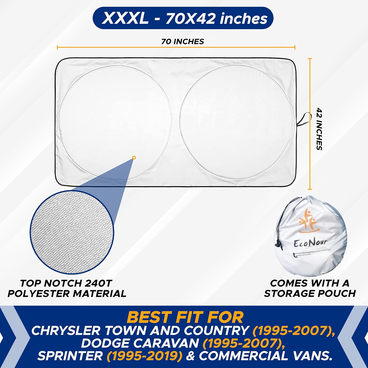 - Provides a Snug Fit for MPVs and Vans: Measuring 70 x 42 inches, EcoNour’s adjustable sunshield for car windshield is tailored for large windshields. It ensures full coverage, making it the perfect car windshield sunshade for family vehicles.