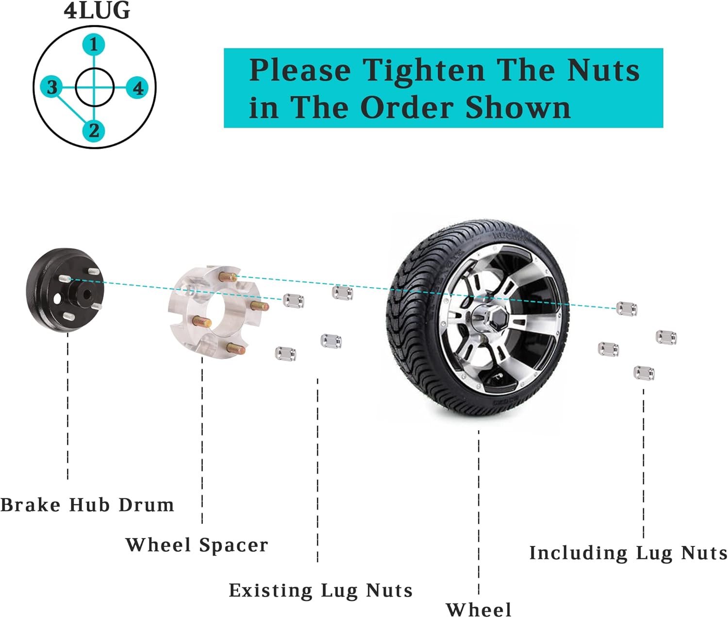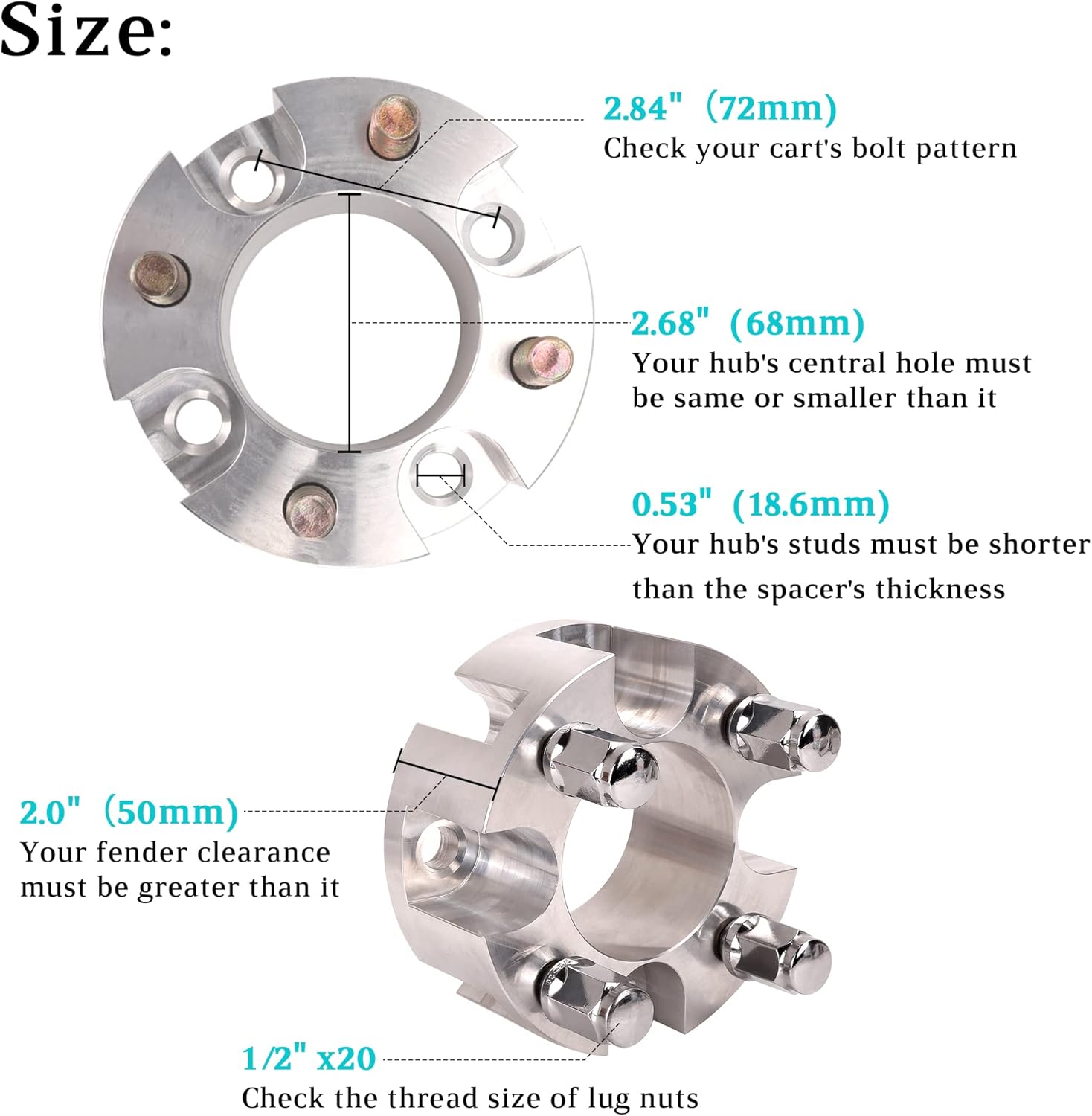 - 2 inch wheel spacers for EZGO, Club Car & Yamaha golf carts with 4×4 bolt pattern and 1/2-20" studs which are heat-treated and hardened for resisting corrosion and rust.