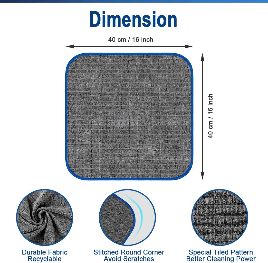 - MICROFIBER TOWELS FOR CAR: These microfiber towels measure 16" x 16" inches each. Such a perfect size that is easy to handle while detailing your beloved car! It's great for cleaning the glass, interiors, paint, wheels, and door jambs, which is also easy to carry and store