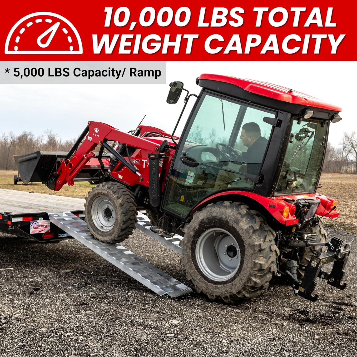- Superior Load Capacity: Our aluminum loading ramps boast a remarkable 10,000-pound total weight capacity (5,000 pounds each), ensuring they can handle the heaviest of loads. These trailer ramps heavy duty are designed for both efficiency and reliability when loading utility trailers and trucks.