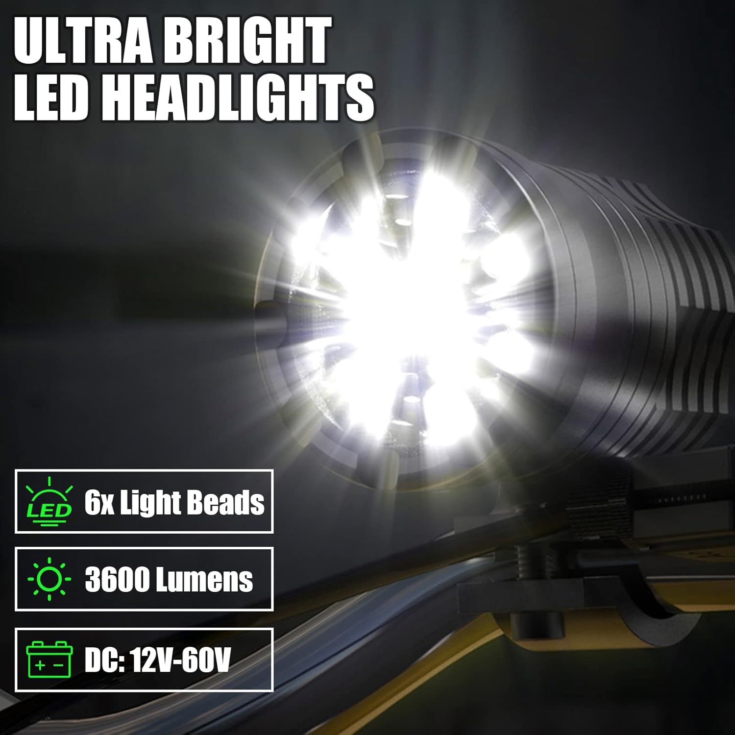- Special Feature : 12-60V, 3 Modes, 40W 3600LM, 6 Light Beads, Waterproof