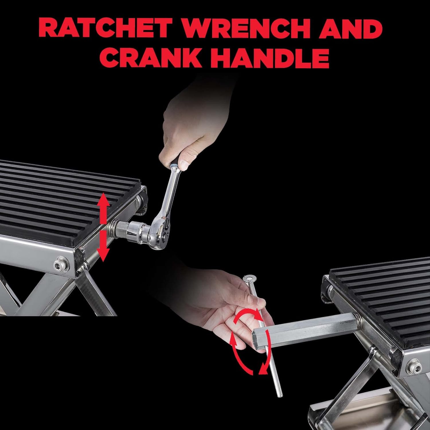 - Equipped with Ratchet Wrench : In addition to the crank handle,we also have an extra ratchet wrench,which is easier to use than crank handle,you will spend less effort to lift the motorcycle up quickly