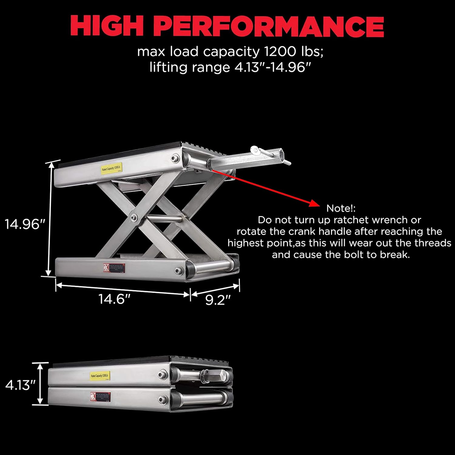 - 4.13"-14.96" Lifting Height : This motorcycle lift jack has a lifting height range of from 4.13" to 14.96".With a max load capacity of 1200 lbs,it can lift most motorcycles,snowmobiles,ATVs,UTVs,street bikes,etc.It's suitable for use in multiple locations such as repair shops,garages and race tracks