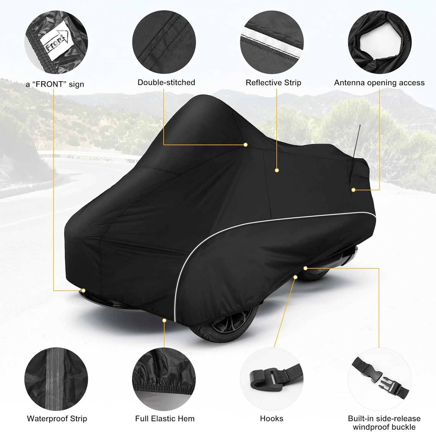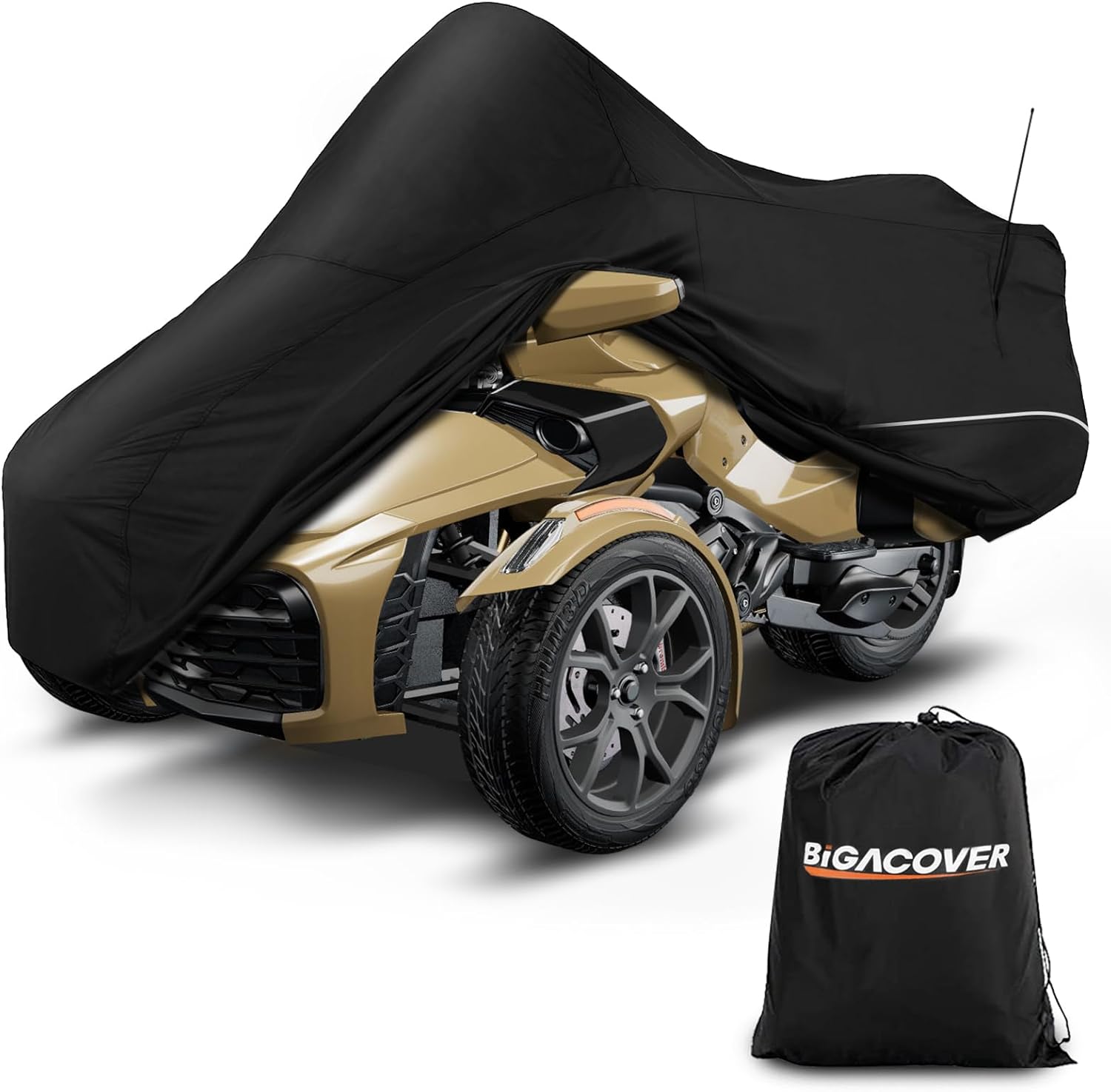 - ăDesignsă(1)Black and Silver combo cover makes your spyder more attractive(2) Pu waterproof Coating: UV protection and heat-proof,prevent cracking and aging of inner decoration leather and plastic. (3) Two Silver Reflective Strips to prevent collisions during the night. (4) It comes with a âFRONTâ sign, A windproof buckle and a storage bag.ďź5ďźWaterproof: Double-stitched & Waterproof Strip . (6)A velcro opening for antenna