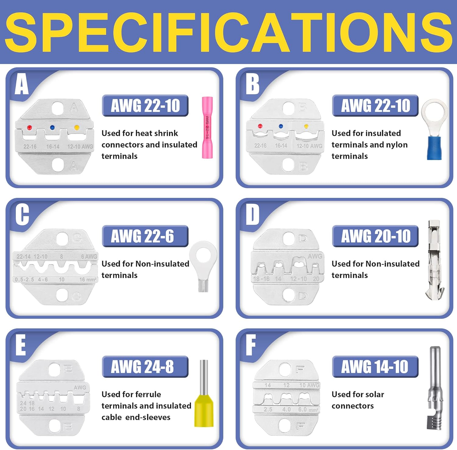 - Choose Without Barriers-Your equipment should never hold you back; When you need to change different wire connectors,the AWG-marked chrome-plated crimp dies offer you 6 options including heat shrink connectors,Insulated and nylon wire terminals,Non-insulated terminals,Insulated cable-end sleeves,open barrel terminals and solar connectors.Easy to operate, no confusion!