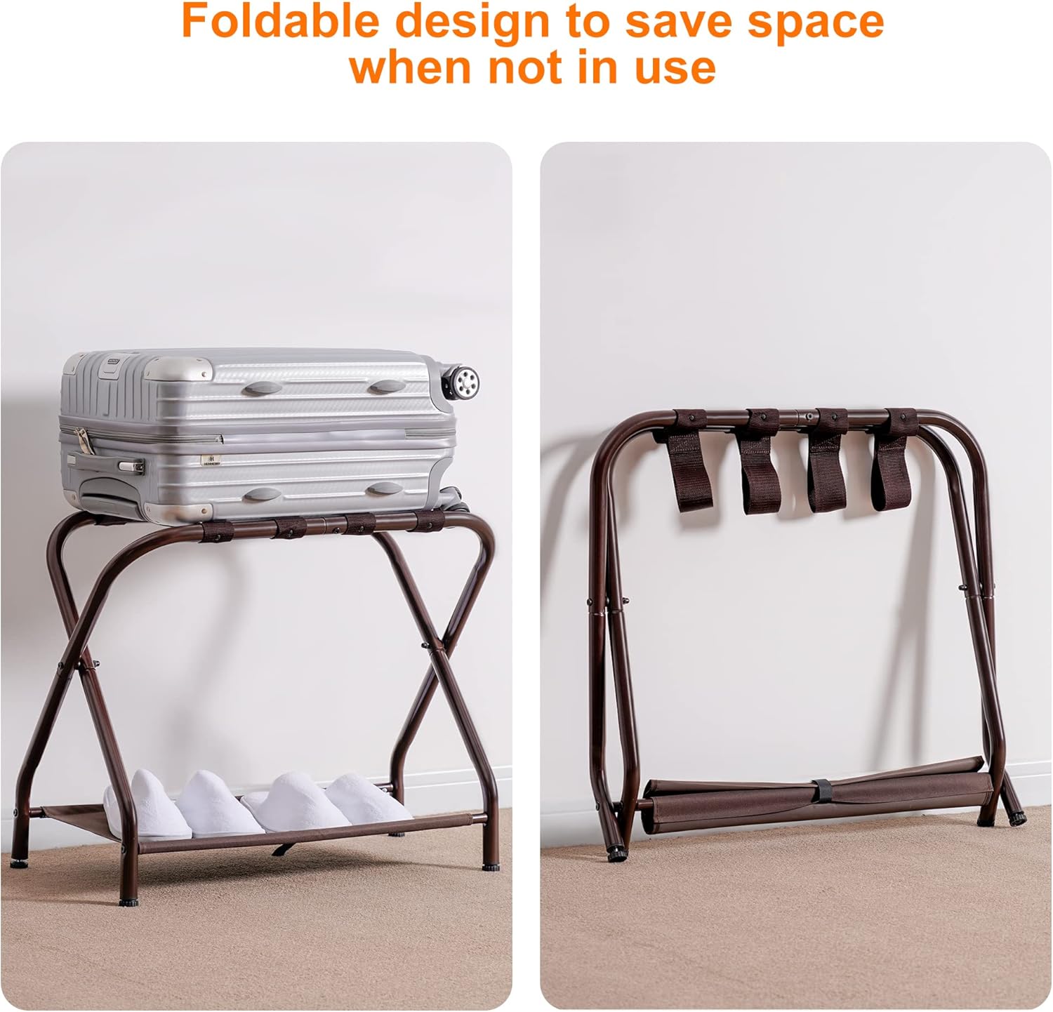 - Awesome addition for guest room: It was sturdy enough to hold a huge suitcase. Having the extra shelf allows storage for a tote bag or Shoes. The racks are very lightweight and fold up for easy, compact storage.