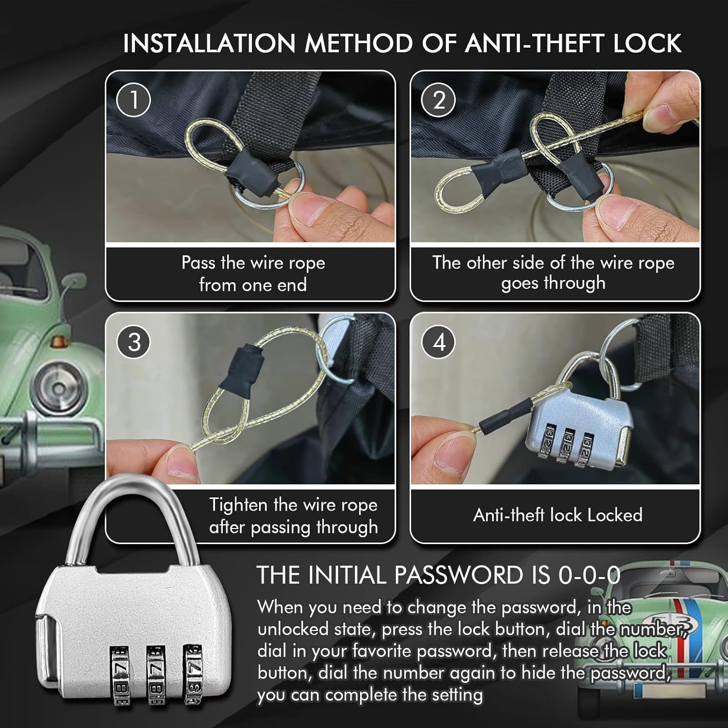 - đăUpgrade Windproof Designăâ A windproof fixed buckle pass through the middle of the car for easy fixing; âĄ2 windproof belts at the front and rear; â˘4 straps to tie the cover to the four wheels; âŁElastic band at the bottom can easily adjust the size of the cover; â¤Double stitching ensures that the cover will not tear easily, making it more durable; âĽThe included safety latch secures the cover. Multiple upgraded designs keep your protective cover from being blown away even in strong winds.
