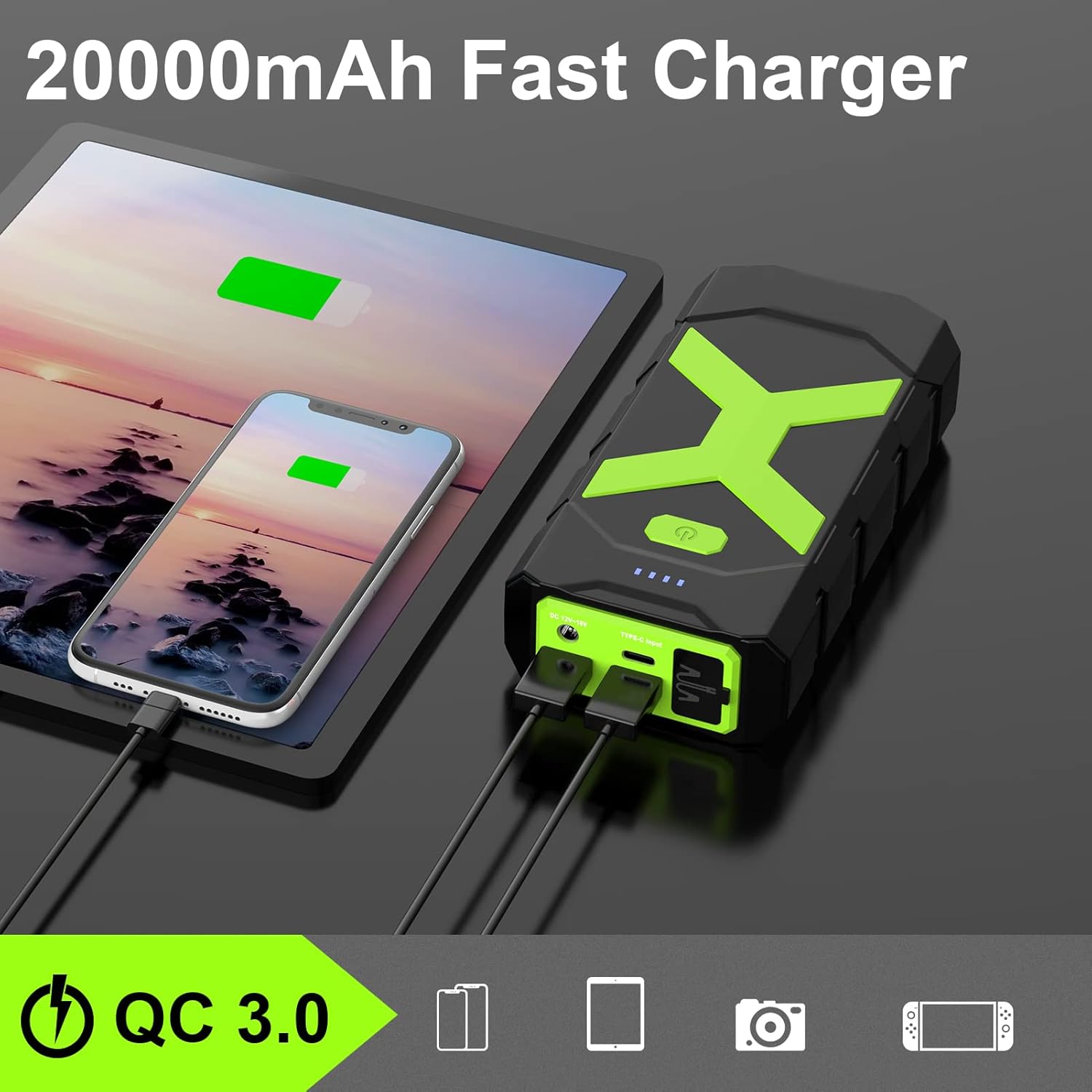 - ăLONG LASTING & LARGE CAPACITYăThis A9 jumpstart was used a premium lithium-ion battery pack, 20000 mAh large capacity battery backup can start dead battery over 30 times and recharge your iPhone 4x, watch 10x, headphones 15x, suitable for more on-the-go devices; 18W Type-C input and QC 3.0 output allow you to power them up any time any where