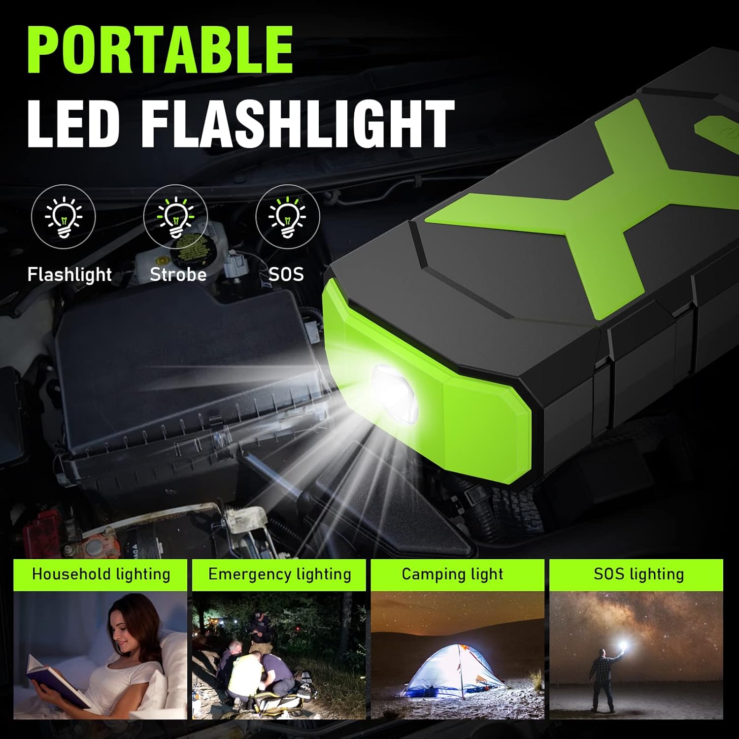 - ăMULTI FUNCATION JUMP BOXă - Not just a jump box, it has 3 LED lights modes: Flash Light, Strobe Light, and SOS Light. This multi-purpose flashlight comes in handy in case of picnic, travel, emergency and outdoor adventures; 400 LM 5W LED can work more than 10 hours,weather you take it for reading or for help