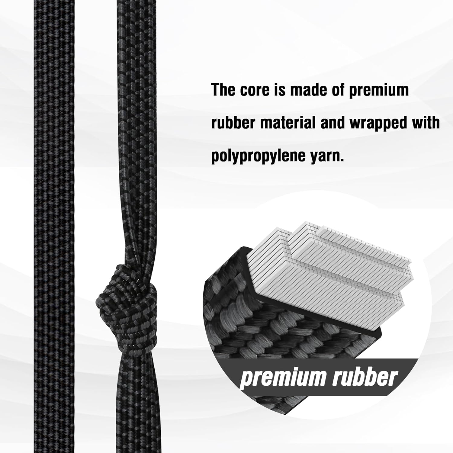 - Heavy Duty Bungee Cords with Hooks: The super elastic cords are made from a UV-resistant, cross-woven rubber and latex blend which can withstand UV rays and weather damage, will not become thin or brittle over time, the hooks are constructed with durable, anti-corrosion metal and covered in a non-scratch coating to protect them from scrapes, ensure long-term use.