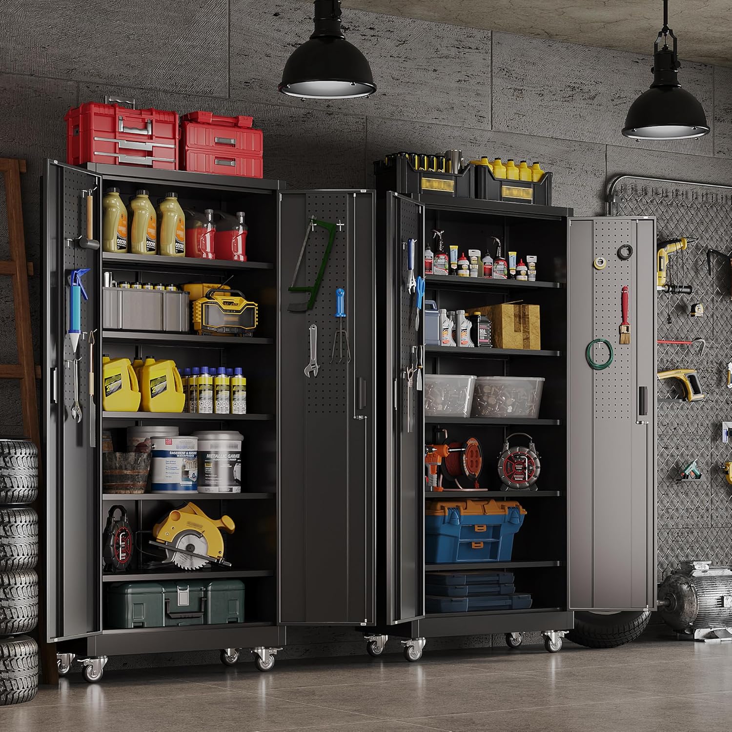 Garage Storage Cabinet with Wheels Pegboard and 5 Adjustable Shelves, 71'' x 32'' x 16''Metal Lockable Cabinet with Magnetic Doors,Tool Storage,Home Office Garage,Gym,School (Black)