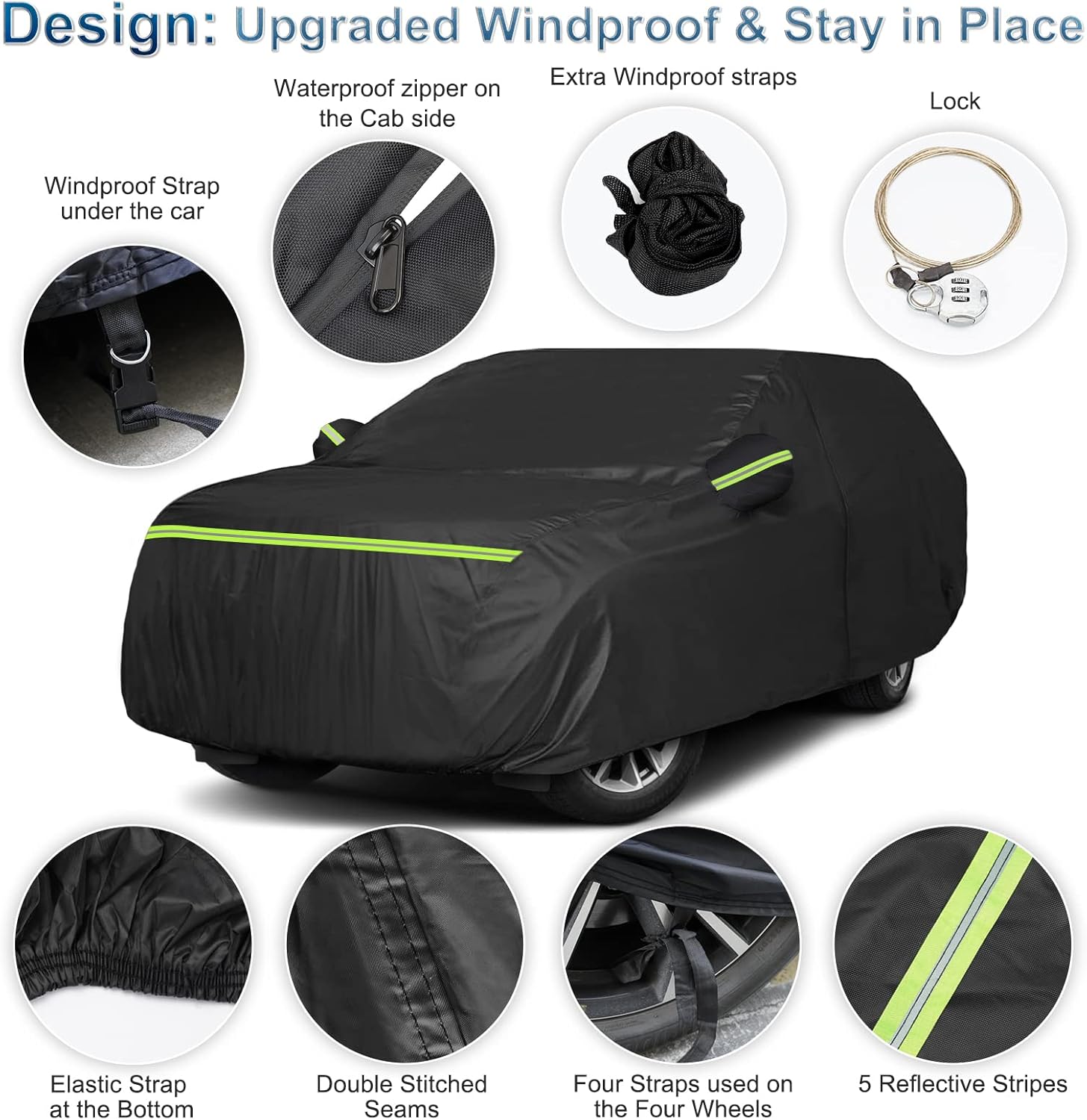 - ăUpgraded Windproof Design-Stay in Placeă*1. Four straps used on the four wheels to make sure the cover stay in the place. *2. A windproof buckle pass through the middle of the car. *3. Elastic Strap at the bottom of front and rear to ensure cover fit your car and to protect your car cover from blowing off, even in heavy wind. *4.Elasticized hem and fixed buckles: against to strong wind,Four straps used on the four wheels to make sure the cover stay in the place.