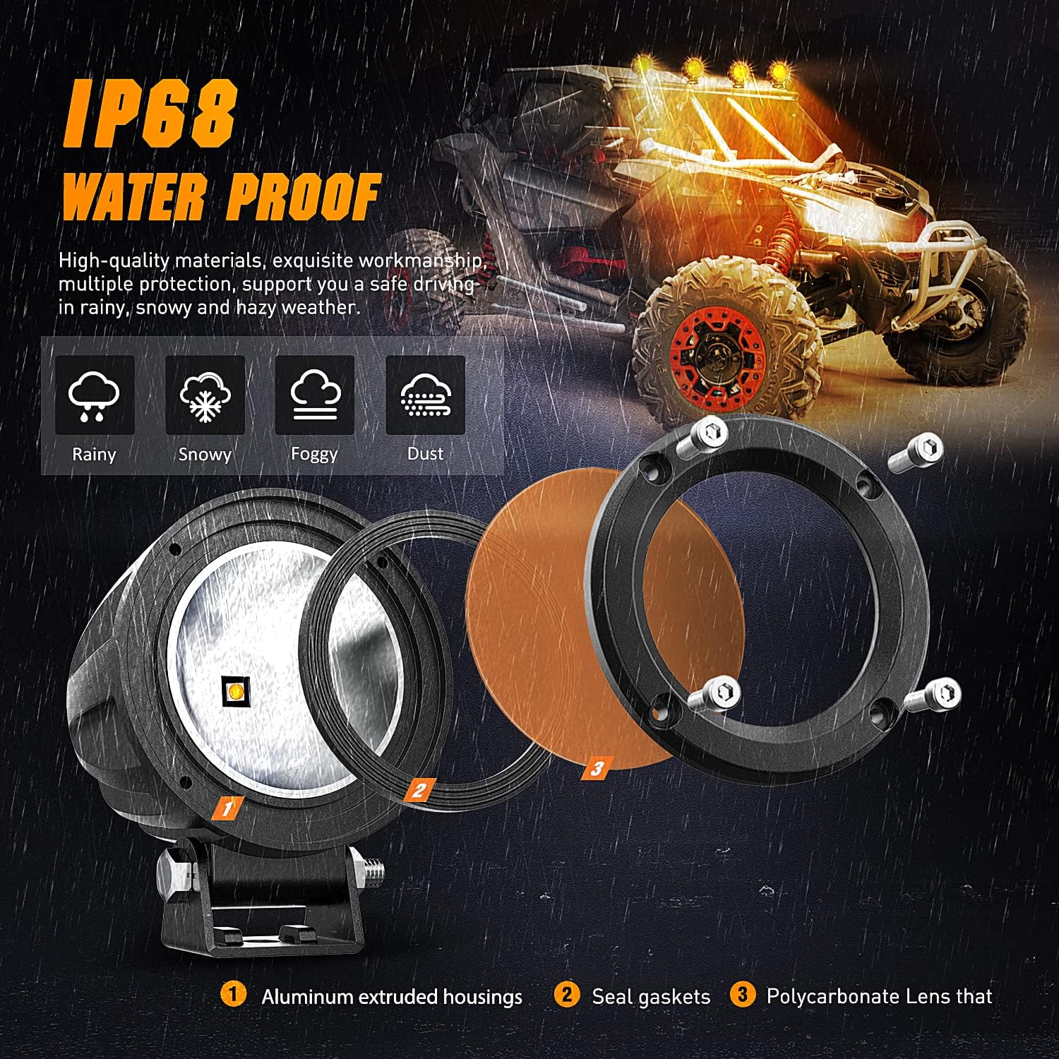 - ăHigh Qualityă: Built in IP68 waterproof, powerful to withstand any harsh environments and weather conditions. Also lights are built-in EMC for EMI/RFI protection, resolve the issue of radio interference and flickering