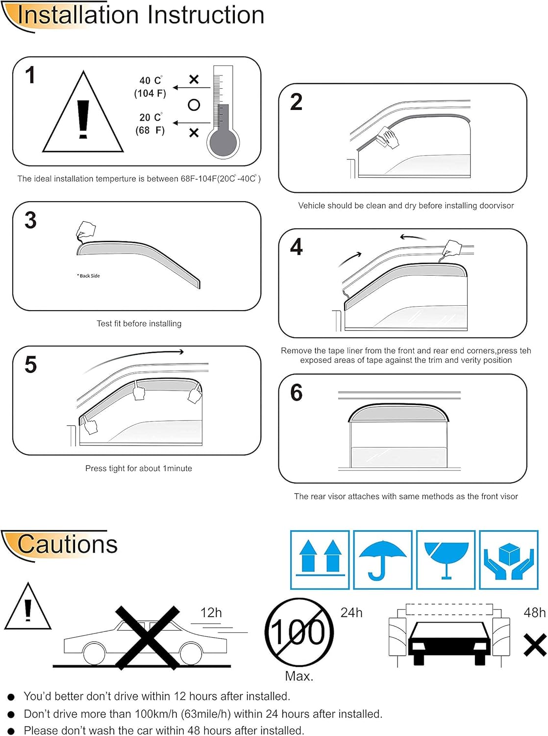 - Easy Installation: Our Window Deflector Visors mounting with tape for extra-strong grip, no drilling is needed ,and no disturbed in the windows up and down.